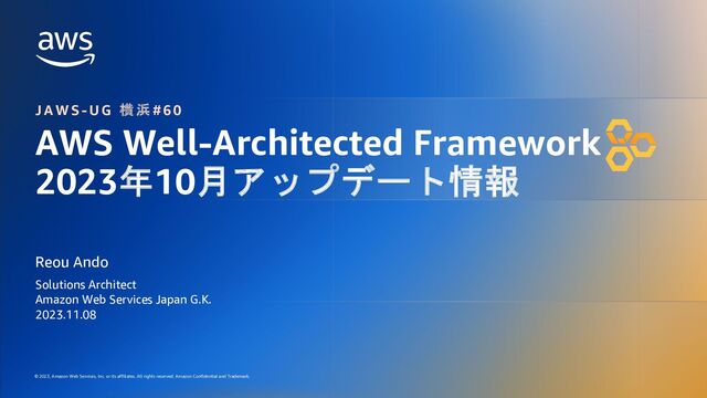 Services, Inc. or its affiliates. All rights reserved. Amazon Confidential and Trademark. AWS Well-Architected Framework|継続的な改善 Well-Architected started 2012 Questions across 4 pillars 2014 Operational Excellence 2016 Self-service, improvement plans 2018 AWS Solutions Architects do reviews 2013 Published framework 2015 APN partners, lenses 2017 Regional launches globally 2019 Framework update, more lenses, API 2020 Custom lenses, BP does not apply 2021 Consolidated Report, Profiles, Review Templates, Framework update 2023 Sustainability Pillar, GovCloud, TA integration, AppRegistry integration 2022 12