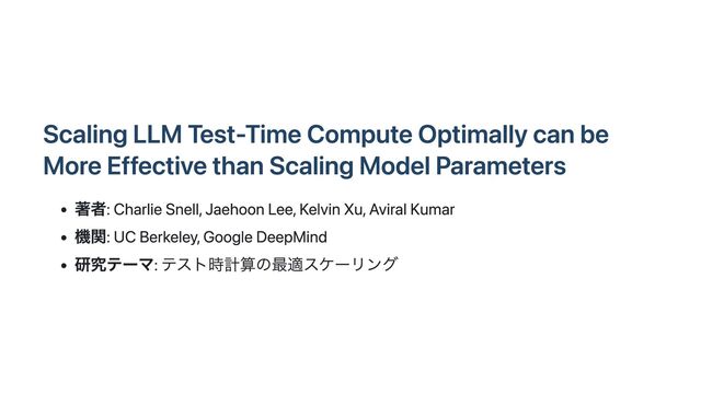 Scaling Model Parameters 著者: Charlie Snell, Jaehoon Lee, Kelvin Xu, Aviral Kumar 機関: UC Berkeley, Google DeepMind 研究テーマ: テスト時計算の最適スケーリング