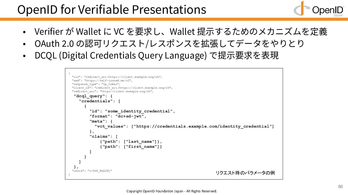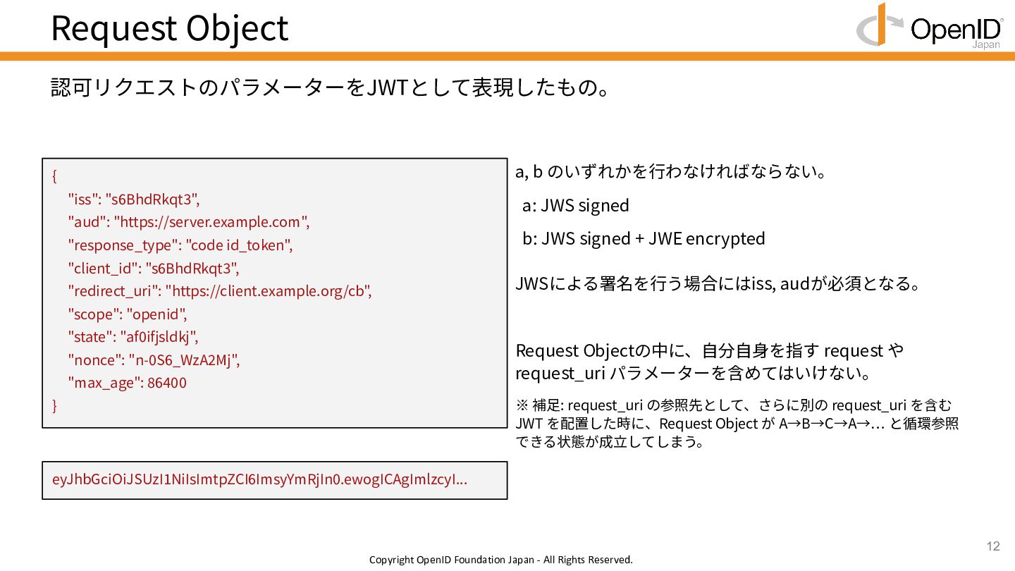 Request (JAR) • OAuth 2.0に対する解決したい課題 ◦ 従来のクエリパラメータは、ユーザーや攻撃者によって容易に改ざん可能であった。 ◦ パラメータがブラウザ履歴、プロキシログ、リファラ等に残るため、個⼈情報の漏洩リスク がある。 認可リクエストのパラメータをJWTとしてひとまとめにし送信する規格[RFC 9101]。 11 認可リクエストパラメータをJWT(Request Object)に集約し、 署名‧暗号化によって保護する⽅法を定義 TLS(通信経路)の安全性に依存せず、アプリケーション層でのエンドツーエンドの完全性と送信元認証を実現する。