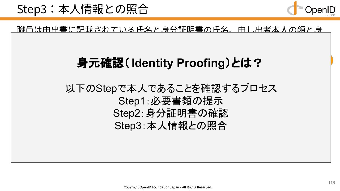 106. Copyright OpenID Foundation Japan - All Rights Reserved. Step3:本⼈情報との照合 116