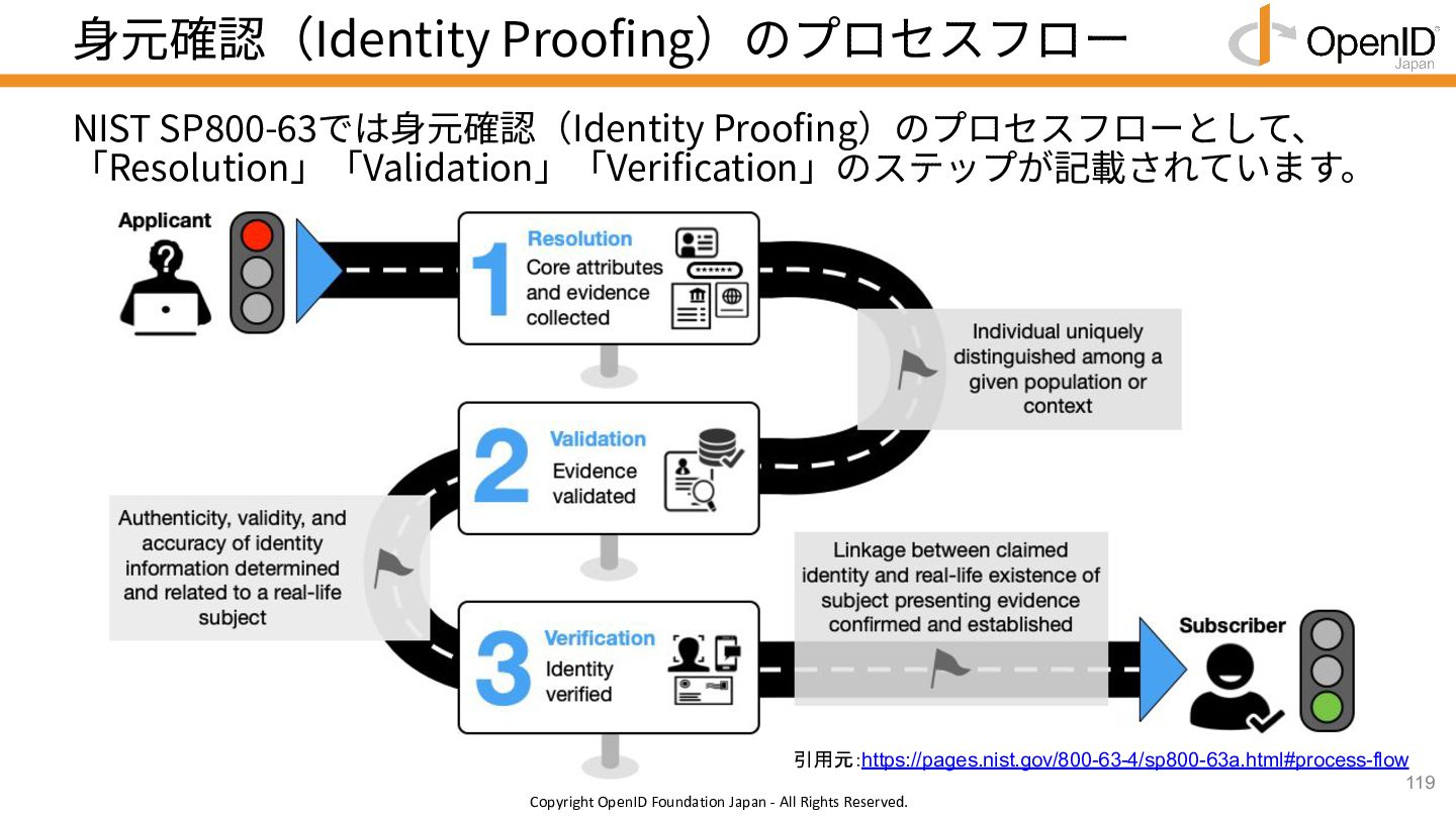 119 NIST SP800-63では⾝元確認(Identity Proofing)のプロセスフローとして、 「Resolution」「Validation」「Verification」のステップが記載されています。 引用元:https://pages.nist.gov/800-63-4/sp800-63a.html#process-flow