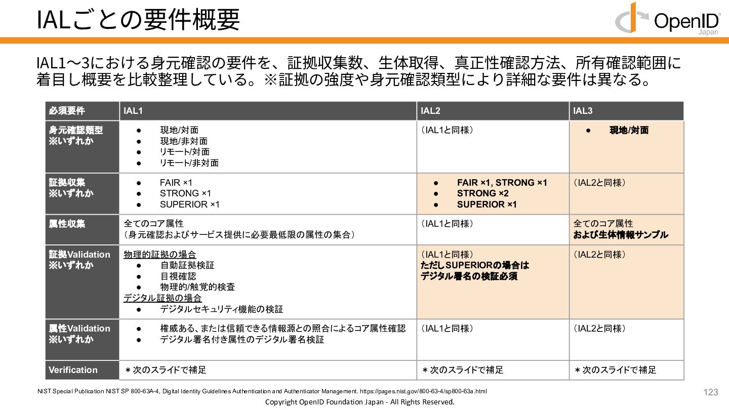 Level)とは? 121 すべてのオンライン⼿続きに必要以上の⾝元確認を⾏うと利便性が下がってしま うため、段階的なレベルを設けたものです。 IAL1 IAL2 IAL3 IAL1 の ID 検証プロセスでは、さまざまな許容可能な手法を使用して悪意のある人物によ る ID の不正な主張を検出すると同時に、ユーザーの採用を促進し、 正当なユーザーの拒 否を最小限に抑え 、アプリケーションの離脱を減らします。 IAL2 の ID 証明には、IAL1 に比べて、なりすまし攻撃やその他の ID 証明エラーをより 軽減するため の追加の証拠、検証、および検証要件が含まれています。 IAL3 は、IAL2 で必要な手順にさらなる厳しさを加え、 なりすましやその他の形式の ID 詐 欺から ID と RP をさらに保護 するために、生体認証情報の比較、収集、および保持の使 用を含む追加の特定のプロセスに従います。 引用元:Identity Proofing Requirements