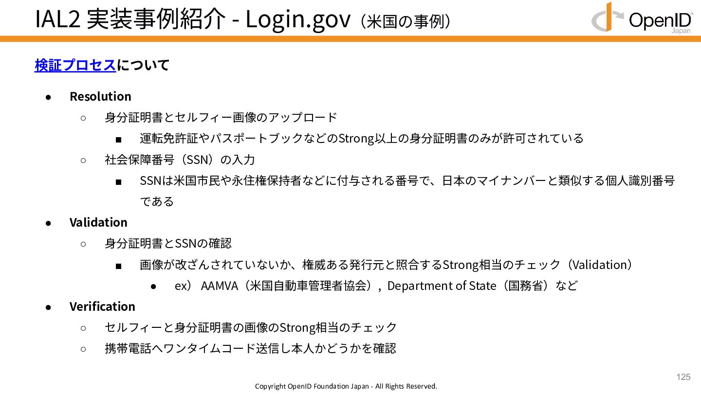 - Login.gov(⽶国の事例) 125 検証プロセスについて • Resolution ◦ ⾝分証明書とセルフィー画像のアップロード ▪ 運転免許証やパスポートブックなどのStrong以上の⾝分証明書のみが許可されている ◦ 社会保障番号(SSN)の⼊⼒ ▪ SSNは⽶国市⺠や永住権保持者などに付与される番号で、⽇本のマイナンバーと類似する個⼈識別番号 である • Validation ◦ ⾝分証明書とSSNの確認 ▪ 画像が改ざんされていないか、権威ある発⾏元と照合するStrong相当のチェック(Validation) • ex) AAMVA(⽶国⾃動⾞管理者協会), Department of State(国務省)など • Verification ◦ セルフィーと⾝分証明書の画像のStrong相当のチェック ◦ 携帯電話へワンタイムコード送信し本⼈かどうかを確認
