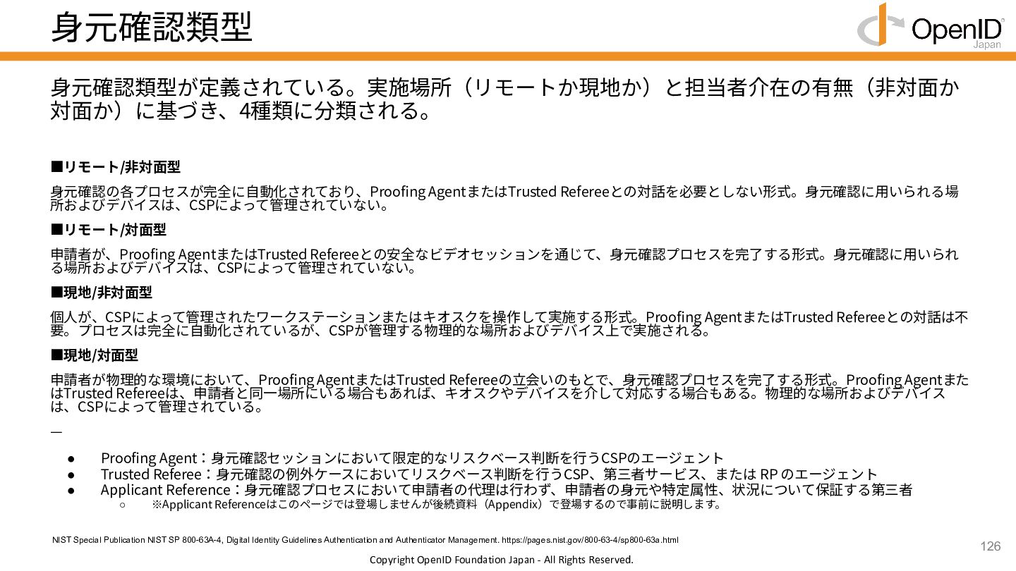 AgentまたはTrusted Refereeとの対話を必要としない形式。⾝元確認に⽤いられる場 所およびデバイスは、CSPによって管理されていない。 ▪リモート/対⾯型 申請者が、Proofing AgentまたはTrusted Refereeとの安全なビデオセッションを通じて、⾝元確認プロセスを完了する形式。⾝元確認に⽤いられ る場所およびデバイスは、CSPによって管理されていない。 ▪現地/⾮対⾯型 個⼈が、CSPによって管理されたワークステーションまたはキオスクを操作して実施する形式。Proofing AgentまたはTrusted Refereeとの対話は不 要。プロセスは完全に⾃動化されているが、CSPが管理する物理的な場所およびデバイス上で実施される。 ▪現地/対⾯型 申請者が物理的な環境において、Proofing AgentまたはTrusted Refereeの⽴会いのもとで、⾝元確認プロセスを完了する形式。Proofing Agentまた はTrusted Refereeは、申請者と同⼀場所にいる場合もあれば、キオスクやデバイスを介して対応する場合もある。物理的な場所およびデバイス は、CSPによって管理されている。 — • Proofing Agent:⾝元確認セッションにおいて限定的なリスクベース判断を⾏うCSPのエージェント • Trusted Referee:⾝元確認の例外ケースにおいてリスクベース判断を⾏うCSP、第三者サービス、または RP のエージェント • Applicant Reference:⾝元確認プロセスにおいて申請者の代理は⾏わず、申請者の⾝元や特定属性、状況について保証する第三者 ◦ ※Applicant Referenceはこのページでは登場しませんが後続資料(Appendix)で登場するので事前に説明します。 ⾝元確認類型 ⾝元確認類型が定義されている。実施場所(リモートか現地か)と担当者介在の有無(⾮対⾯か 対⾯か)に基づき、4種類に分類される。 126 NIST Special Publication NIST SP 800-63A-4, Digital Identity Guidelines Authentication and Authenticator Management. https://pages.nist.gov/800-63-4/sp800-63a.html