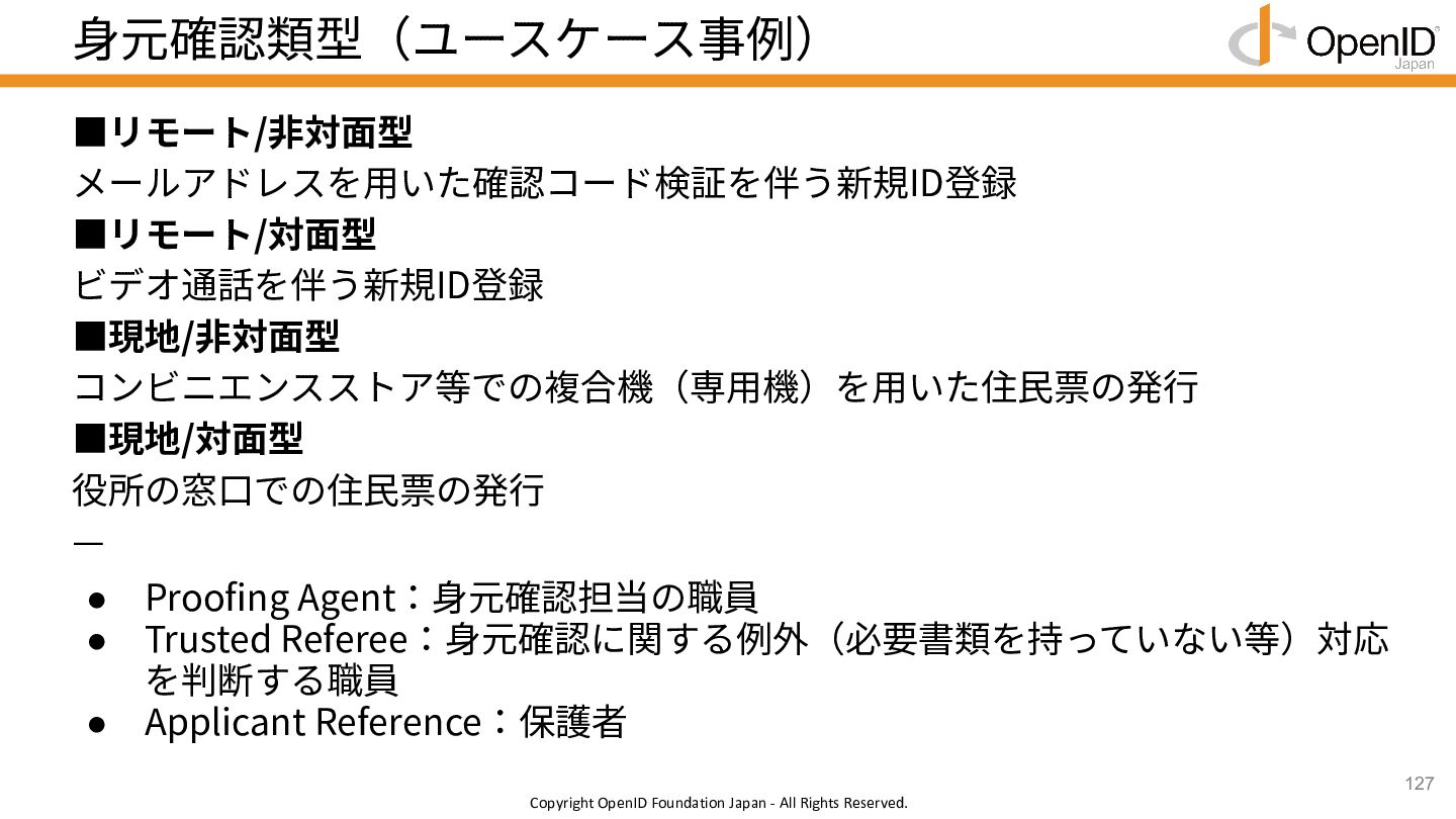 ▪リモート/対⾯型 ビデオ通話を伴う新規ID登録 ▪現地/⾮対⾯型 コンビニエンスストア等での複合機(専⽤機)を⽤いた住⺠票の発⾏ ▪現地/対⾯型 役所の窓⼝での住⺠票の発⾏ — • Proofing Agent:⾝元確認担当の職員 • Trusted Referee:⾝元確認に関する例外(必要書類を持っていない等)対応 を判断する職員 • Applicant Reference:保護者 ⾝元確認類型(ユースケース事例) 127