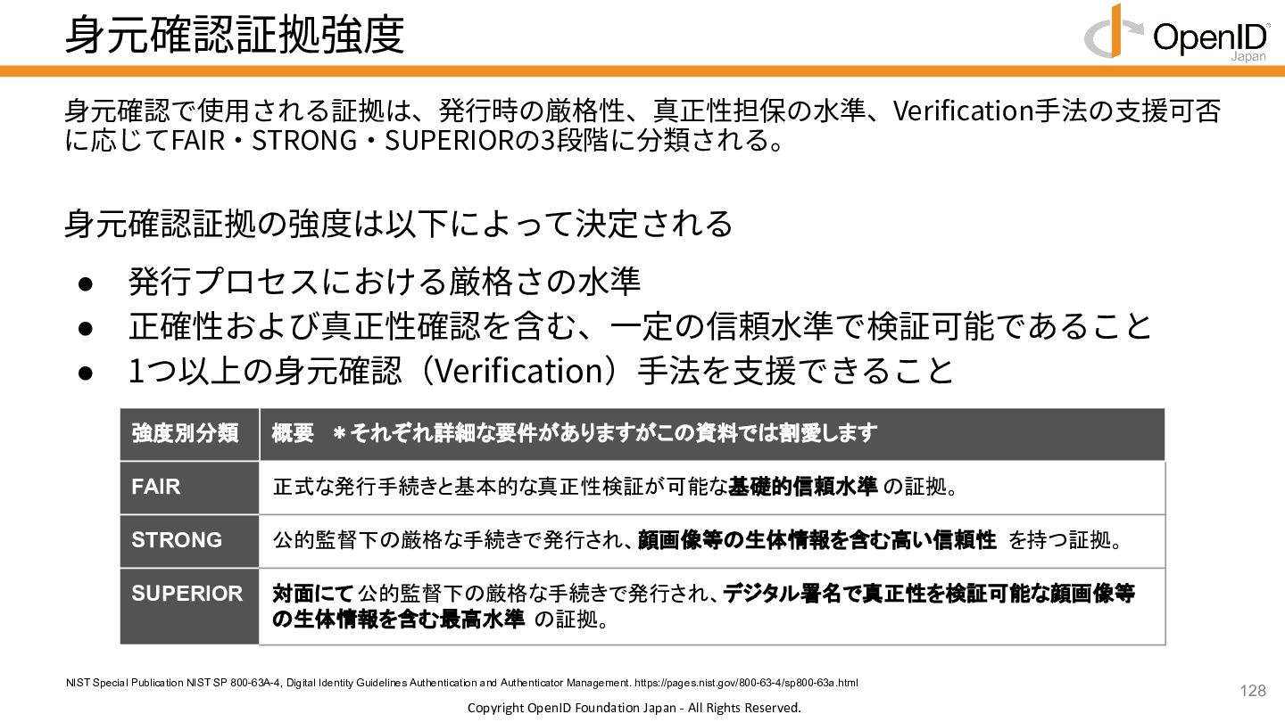 発⾏プロセスにおける厳格さの⽔準 • 正確性および真正性確認を含む、⼀定の信頼⽔準で検証可能であること • 1つ以上の⾝元確認(Verification)⼿法を⽀援できること ⾝元確認証拠強度 ⾝元確認で使⽤される証拠は、発⾏時の厳格性、真正性担保の⽔準、Verification⼿法の⽀援可否 に応じてFAIR‧STRONG‧SUPERIORの3段階に分類される。 128 NIST Special Publication NIST SP 800-63A-4, Digital Identity Guidelines Authentication and Authenticator Management. https://pages.nist.gov/800-63-4/sp800-63a.html 強度別分類 概要 *それぞれ詳細な要件がありますがこの資料では割愛します FAIR 正式な発行手続きと基本的な真正性検証が可能な基礎的信頼水準 の証拠。 STRONG 公的監督下の厳格な手続きで発行され、顔画像等の生体情報を含む高い信頼性 を持つ証拠。 SUPERIOR 対面にて公的監督下の厳格な手続きで発行され、デジタル署名で真正性を検証可能な顔画像等 の生体情報を含む最高水準 の証拠。