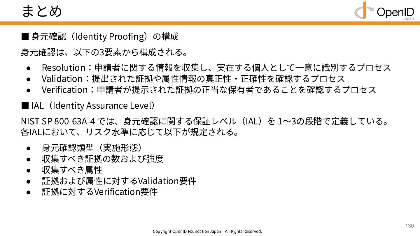 Proofing)の構成 ⾝元確認は、以下の3要素から構成される。 • Resolution:申請者に関する情報を収集し、実在する個⼈として⼀意に識別するプロセス • Validation:提出された証拠や属性情報の真正性‧正確性を確認するプロセス • Verification:申請者が提⽰された証拠の正当な保有者であることを確認するプロセス ▪ IAL(Identity Assurance Level) NIST SP 800-63A-4 では、⾝元確認に関する保証レベル(IAL)を 1〜3の段階で定義している。 各IALにおいて、リスク⽔準に応じて以下が規定される。 • ⾝元確認類型(実施形態) • 収集すべき証拠の数および強度 • 収集すべき属性 • 証拠および属性に対するValidation要件 • 証拠に対するVerification要件 まとめ 130