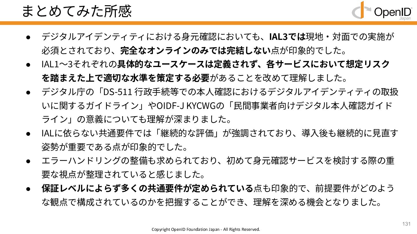 • デジタルアイデンティティにおける⾝元確認においても、IAL3では現地‧対⾯での実施が 必須とされており、完全なオンラインのみでは完結しない点が印象的でした。 • IAL1〜3それぞれの具体的なユースケースは定義されず、各サービスにおいて想定リスク を踏まえた上で適切な⽔準を策定する必要があることを改めて理解しました。 • デジタル庁の「DS-511 ⾏政⼿続等での本⼈確認におけるデジタルアイデンティティの取扱 いに関するガイドライン」やOIDF-J KYCWGの「⺠間事業者向けデジタル本⼈確認ガイド ライン」の意義についても理解が深まりました。 • IALに依らない共通要件では「継続的な評価」が強調されており、導⼊後も継続的に⾒直す 姿勢が重要である点が印象的でした。 • エラーハンドリングの整備も求められており、初めて⾝元確認サービスを検討する際の重 要な視点が整理されていると感じました。 • 保証レベルによらず多くの共通要件が定められている点も印象的で、前提要件がどのよう な観点で構成されているのかを把握することができ、理解を深める機会となりました。
