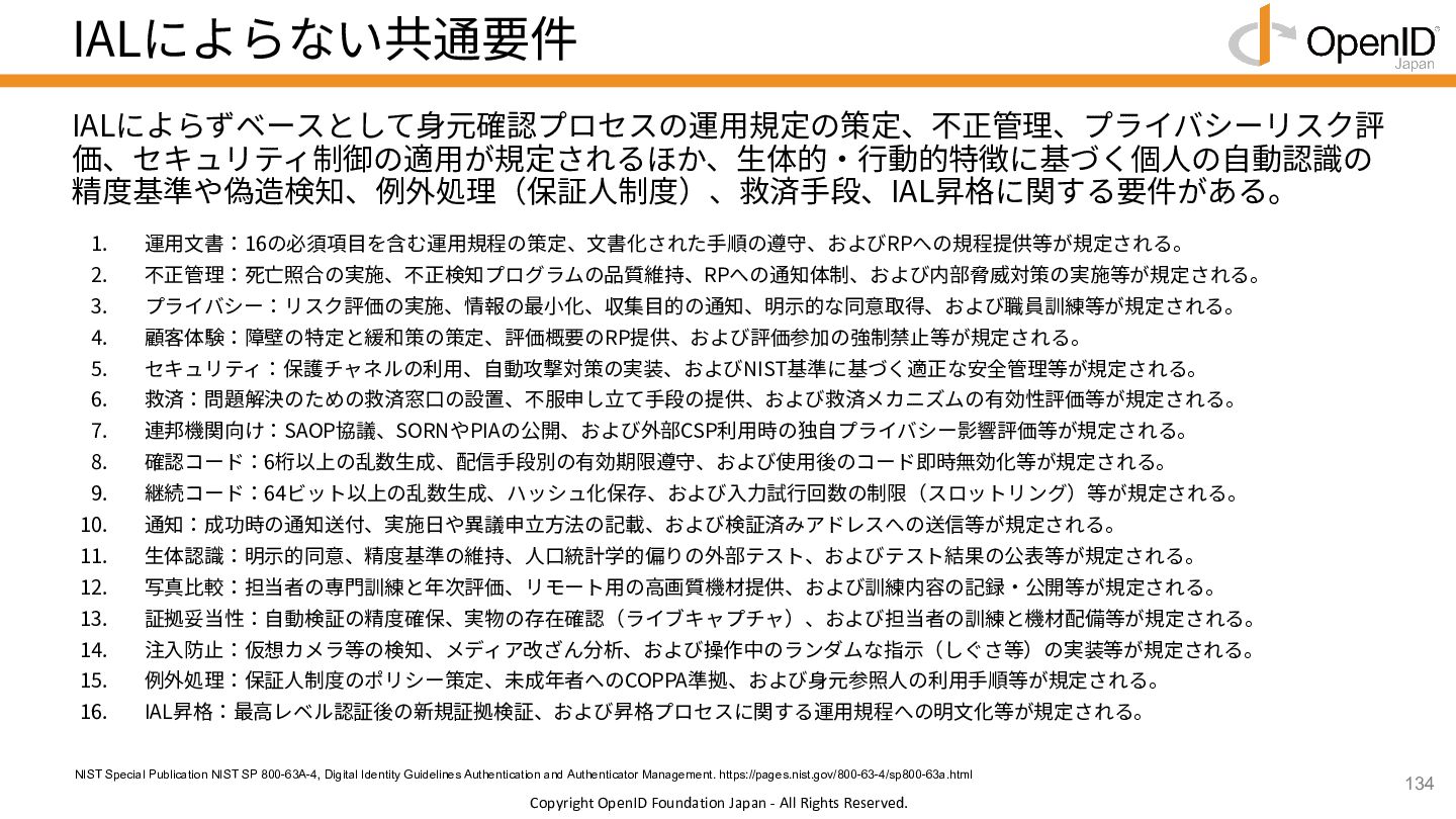 134. Copyright OpenID Foundation Japan - All Rights Reserved. ▪⾝元確認プロセスで⽣体認識を利⽤する際の要件 •