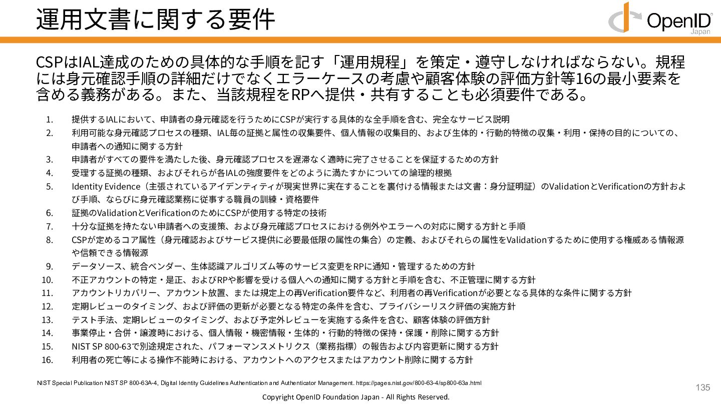 135. Copyright OpenID Foundation Japan - All Rights Reserved. ⽣体認識の使⽤に関する要件(3/3) ▪申請者から⽣体‧⾏動的特徴を収集する際の要件