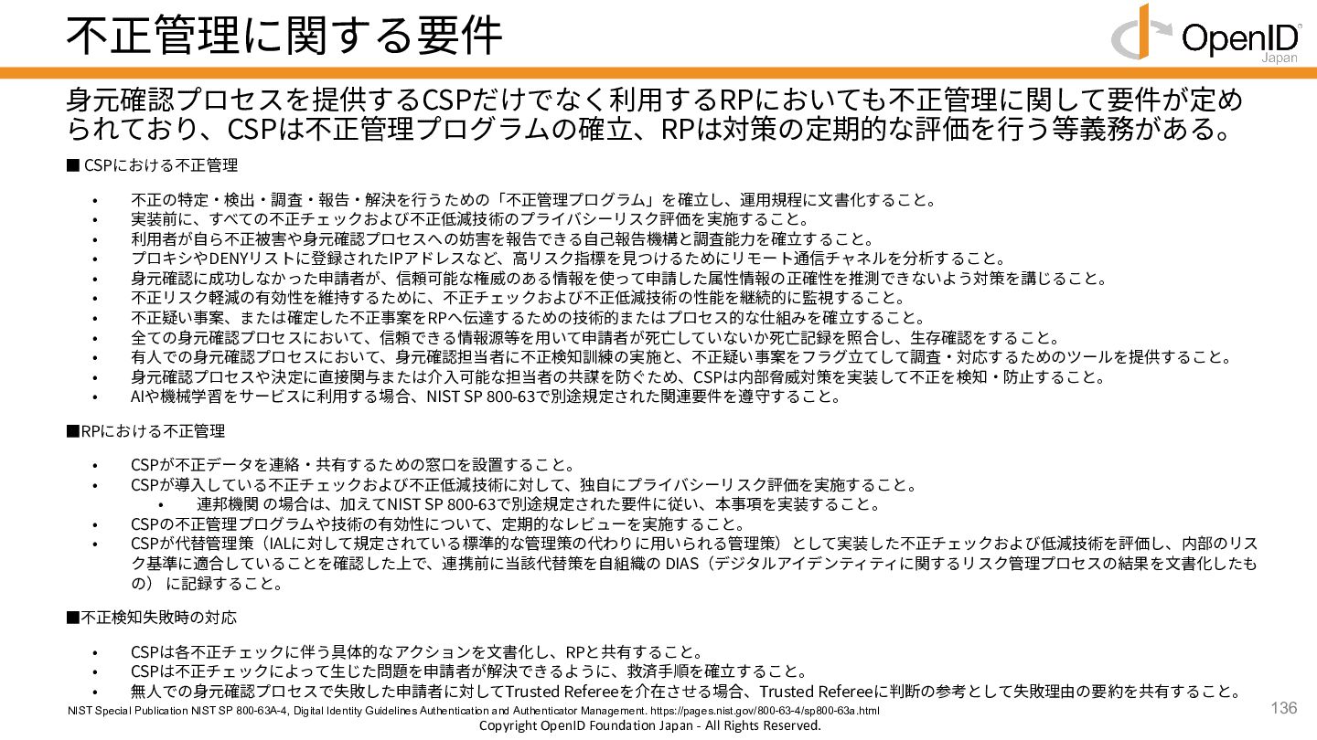 CSPにおける不正管理 • 不正の特定‧検出‧調査‧報告‧解決を⾏うための「不正管理プログラム」を確⽴し、運⽤規程に⽂書化すること。 • 実装前に、すべての不正チェックおよび不正低減技術のプライバシーリスク評価を実施すること。 • 利⽤者が⾃ら不正被害や⾝元確認プロセスへの妨害を報告できる⾃⼰報告機構と調査能⼒を確⽴すること。 • プロキシやDENYリストに登録されたIPアドレスなど、⾼リスク指標を⾒つけるためにリモート通信チャネルを分析すること。 • ⾝元確認に成功しなかった申請者が、信頼可能な権威のある情報を使って申請した属性情報の正確性を推測できないよう対策を講じること。 • 不正リスク軽減の有効性を維持するために、不正チェックおよび不正低減技術の性能を継続的に監視すること。 • 不正疑い事案、または確定した不正事案をRPへ伝達するための技術的またはプロセス的な仕組みを確⽴すること。 • 全ての⾝元確認プロセスにおいて、信頼できる情報源等を⽤いて申請者が死亡していないか死亡記録を照合し、⽣存確認をすること。 • 有⼈での⾝元確認プロセスにおいて、⾝元確認担当者に不正検知訓練の実施と、不正疑い事案をフラグ⽴てして調査‧対応するためのツールを提供すること。 • ⾝元確認プロセスや決定に直接関与または介⼊可能な担当者の共謀を防ぐため、CSPは内部脅威対策を実装して不正を検知‧防⽌すること。 • AIや機械学習をサービスに利⽤する場合、NIST SP 800-63で別途規定された関連要件を遵守すること。 ▪RPにおける不正管理 • CSPが不正データを連絡‧共有するための窓⼝を設置すること。 • CSPが導⼊している不正チェックおよび不正低減技術に対して、独⾃にプライバシーリスク評価を実施すること。 • 連邦機関 の場合は、加えてNIST SP 800-63で別途規定された要件に従い、本事項を実装すること。 • CSPの不正管理プログラムや技術の有効性について、定期的なレビューを実施すること。 • CSPが代替管理策(IALに対して規定されている標準的な管理策の代わりに⽤いられる管理策)として実装した不正チェックおよび低減技術を評価し、内部のリス ク基準に適合していることを確認した上で、連携前に当該代替策を⾃組織の DIAS(デジタルアイデンティティに関するリスク管理プロセスの結果を⽂書化したも の) に記録すること。 ▪不正検知失敗時の対応 • CSPは各不正チェックに伴う具体的なアクションを⽂書化し、RPと共有すること。 • CSPは不正チェックによって⽣じた問題を申請者が解決できるように、救済⼿順を確⽴すること。 • 無⼈での⾝元確認プロセスで失敗した申請者に対してTrusted Refereeを介在させる場合、Trusted Refereeに判断の参考として失敗理由の要約を共有すること。 NIST Special Publication NIST SP 800-63A-4, Digital Identity Guidelines Authentication and Authenticator Management. https://pages.nist.gov/800-63-4/sp800-63a.html ⾝元確認プロセスを提供するCSPだけでなく利⽤するRPにおいても不正管理に関して要件が定め られており、CSPは不正管理プログラムの確⽴、RPは対策の定期的な評価を⾏う等義務がある。 136
