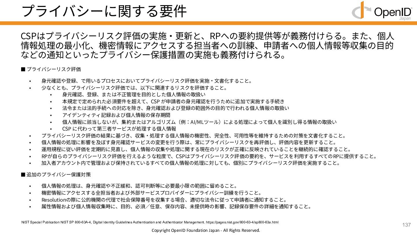 プライバシーリスク評価 • ⾝元確認や登録、で⽤いるプロセスにおいてプライバシーリスク評価を実施‧⽂書化すること。 • 少なくとも、プライバシーリスク評価では、以下に関連するリスクを評価すること。 • ⾝元確認、登録、または不正管理を⽬的とした個⼈情報の取扱い • 本規定で定められた必須要件を超えて、CSP が申請者の⾝元確認を⾏うために追加で実施する⼿続き • 法令または法的⼿続への対応を除き、⾝元確認および登録の範囲外の⽬的で⾏われる個⼈情報の取扱い • アイデンティティ記録および個⼈情報の保存期間 • 個⼈情報に該当しないが、集約またはアルゴリズム(例:AI/MLツール)による処理によって個⼈を識別し得る情報の取扱い • CSP に代わって第三者サービスが処理する個⼈情報 • プライバシーリスク評価の結果に基づき、収集‧処理する個⼈情報の機密性、完全性、可⽤性等を維持するための対策を⽂書化すること。 • 個⼈情報の処理に影響を及ぼす⾝元確認サービスの変更を⾏う際は、常にプライバシーリスクを再評価し、評価内容を更新すること。 • 運⽤規程に従い評価を定期的に⾒直し、個⼈情報の収集や処理に関する現在のリスクが正確に反映されていることを継続的に確認すること。 • RPが⾃らのプライバシーリスク評価を⾏えるような粒度で、CSPはプライバシーリスク評価の要約を、サービスを利⽤するすべてのRPに提供すること。 • 加⼊者アカウント内で管理および保持されているすべての個⼈情報の処理に対しても、個別にプライバシーリスク評価を実施すること。 ▪ 追加のプライバシー保護対策 • 個⼈情報の処理は、⾝元確認や不正緩和、認可判断等に必要最⼩限の範囲に留めること。 • 機密情報にアクセスする全担当者および外部サービスプロバイダーにプライバシー訓練を⾏うこと。 • Resolutionの際に公的機関の代理で社会保障番号を収集する場合、適切な法令に従って申請者に通知すること。 • 属性情報および個⼈情報収集時に、⽬的、必須∕任意、保存内容、未提供時の影響、記録保存要件の詳細を通知すること。 CSPはプライバシーリスク評価の実施‧更新と、RPへの要約提供等が義務付けらる。また、個⼈ 情報処理の最⼩化、機密情報にアクセスする担当者への訓練、申請者への個⼈情報等収集の⽬的 などの通知といったプライバシー保護措置の実施も義務付けられる。 137 NIST Special Publication NIST SP 800-63A-4, Digital Identity Guidelines Authentication and Authenticator Management. https://pages.nist.gov/800-63-4/sp800-63a.html