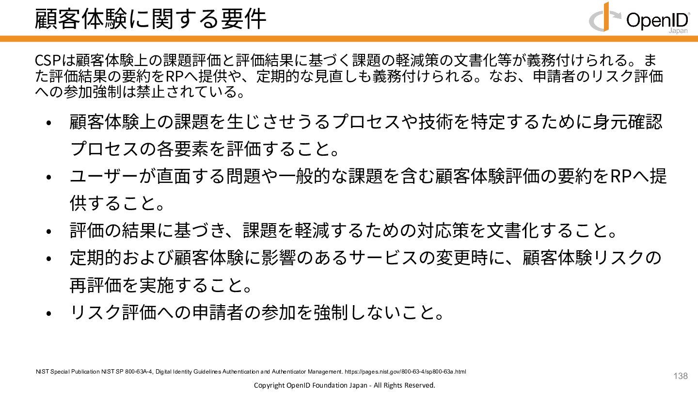 顧客体験上の課題を⽣じさせうるプロセスや技術を特定するために⾝元確認 プロセスの各要素を評価すること。 • ユーザーが直⾯する問題や⼀般的な課題を含む顧客体験評価の要約をRPへ提 供すること。 • 評価の結果に基づき、課題を軽減するための対応策を⽂書化すること。 • 定期的および顧客体験に影響のあるサービスの変更時に、顧客体験リスクの 再評価を実施すること。 • リスク評価への申請者の参加を強制しないこと。 CSPは顧客体験上の課題評価と評価結果に基づく課題の軽減策の⽂書化等が義務付けられる。ま た評価結果の要約をRPへ提供や、定期的な⾒直しも義務付けられる。なお、申請者のリスク評価 への参加強制は禁⽌されている。 138 NIST Special Publication NIST SP 800-63A-4, Digital Identity Guidelines Authentication and Authenticator Management. https://pages.nist.gov/800-63-4/sp800-63a.html