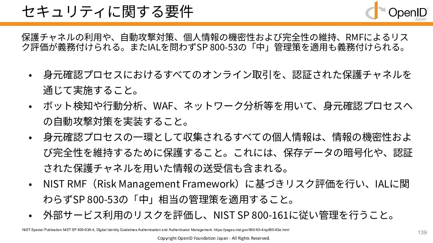 ⾝元確認プロセスにおけるすべてのオンライン取引を、認証された保護チャネルを 通じて実施すること。 • ボット検知や⾏動分析、WAF、ネットワーク分析等を⽤いて、⾝元確認プロセスへ の⾃動攻撃対策を実装すること。 • ⾝元確認プロセスの⼀環として収集されるすべての個⼈情報は、情報の機密性およ び完全性を維持するために保護すること。これには、保存データの暗号化や、認証 された保護チャネルを⽤いた情報の送受信も含まれる。 • NIST RMF(Risk Management Framework)に基づきリスク評価を⾏い、IALに関 わらずSP 800-53の「中」相当の管理策を適⽤すること。 • 外部サービス利⽤のリスクを評価し、NIST SP 800-161に従い管理を⾏うこと。 保護チャネルの利⽤や、⾃動攻撃対策、個⼈情報の機密性および完全性の維持、RMFによるリス ク評価が義務付けられる。またIALを問わずSP 800-53の「中」管理策を適⽤も義務付けられる。 139 NIST Special Publication NIST SP 800-63A-4, Digital Identity Guidelines Authentication and Authenticator Management. https://pages.nist.gov/800-63-4/sp800-63a.html