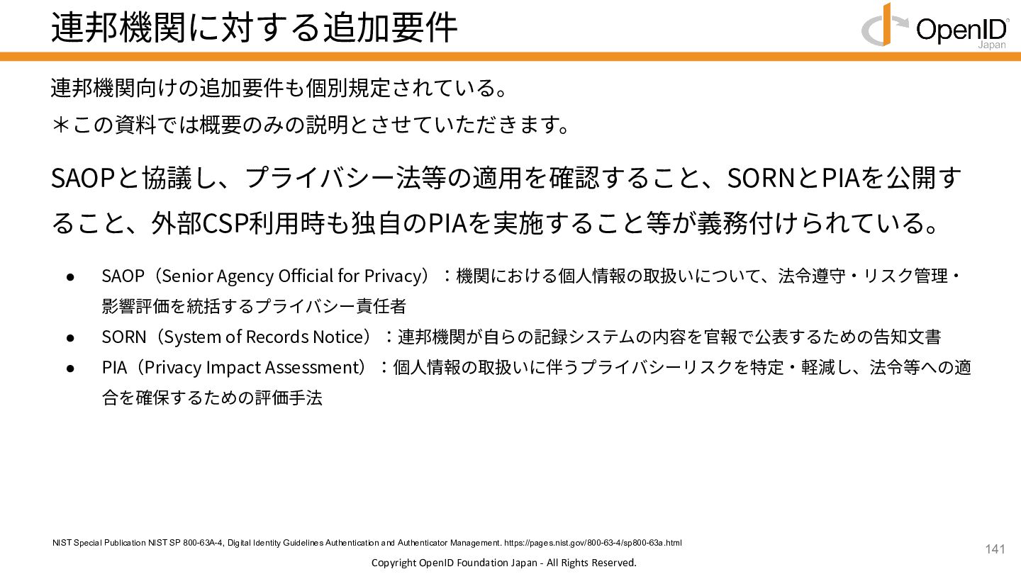 • SAOP(Senior Agency Official for Privacy):機関における個⼈情報の取扱いについて、法令遵守‧リスク管理‧ 影響評価を統括するプライバシー責任者 • SORN(System of Records Notice):連邦機関が⾃らの記録システムの内容を官報で公表するための告知⽂書 • PIA(Privacy Impact Assessment):個⼈情報の取扱いに伴うプライバシーリスクを特定‧軽減し、法令等への適 合を確保するための評価⼿法 連邦機関に対する追加要件 連邦機関向けの追加要件も個別規定されている。 *この資料では概要のみの説明とさせていただきます。 141 NIST Special Publication NIST SP 800-63A-4, Digital Identity Guidelines Authentication and Authenticator Management. https://pages.nist.gov/800-63-4/sp800-63a.html