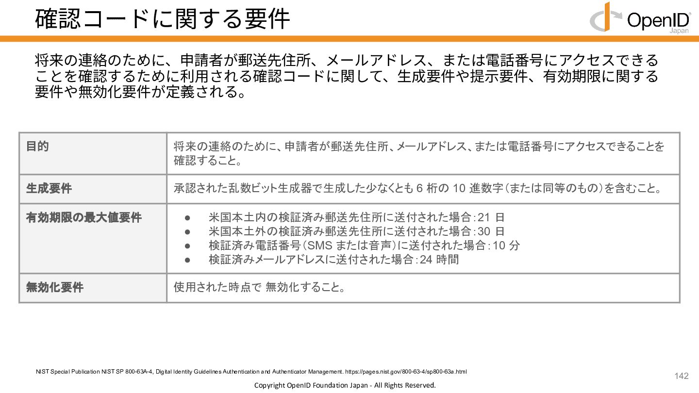 ことを確認するために利⽤される確認コードに関して、⽣成要件や提⽰要件、有効期限に関する 要件や無効化要件が定義される。 142 NIST Special Publication NIST SP 800-63A-4, Digital Identity Guidelines Authentication and Authenticator Management. https://pages.nist.gov/800-63-4/sp800-63a.html ⽬的 将来の連絡のために、申請者が郵送先住所、メールアドレス、または電話番号にアクセスできることを 確認すること。 生成要件 承認された乱数ビット生成器で生成した少なくとも 6 桁の 10 進数字(または同等のもの)を含むこと。 有効期限の最大値要件 • 米国本土内の検証済み郵送先住所に送付された場合:21 日 • 米国本土外の検証済み郵送先住所に送付された場合:30 日 • 検証済み電話番号(SMS または音声)に送付された場合:10 分 • 検証済みメールアドレスに送付された場合:24 時間 無効化要件 使用された時点で 無効化すること。