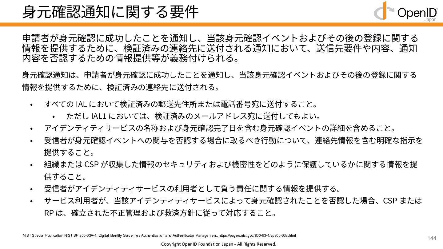 情報を提供するために、検証済みの連絡先に送付される。 • すべての IAL において検証済みの郵送先住所または電話番号宛に送付すること。 • ただし IAL1 においては、検証済みのメールアドレス宛に送付してもよい。 • アイデンティティサービスの名称および⾝元確認完了⽇を含む⾝元確認イベントの詳細を含めること。 • 受信者が⾝元確認イベントへの関与を否認する場合に取るべき⾏動について、連絡先情報を含む明確な指⽰を 提供すること。 • 組織または CSP が収集した情報のセキュリティおよび機密性をどのように保護しているかに関する情報を提 供すること。 • 受信者がアイデンティティサービスの利⽤者として負う責任に関する情報を提供する。 • サービス利⽤者が、当該アイデンティティサービスによって⾝元確認されたことを否認した場合、CSP または RP は、確⽴された不正管理および救済⽅針に従って対応すること。 申請者が⾝元確認に成功したことを通知し、当該⾝元確認イベントおよびその後の登録に関する 情報を提供するために、検証済みの連絡先に送付される通知において、送信先要件や内容、通知 内容を否認するための情報提供等が義務付けられる。 144 NIST Special Publication NIST SP 800-63A-4, Digital Identity Guidelines Authentication and Authenticator Management. https://pages.nist.gov/800-63-4/sp800-63a.html