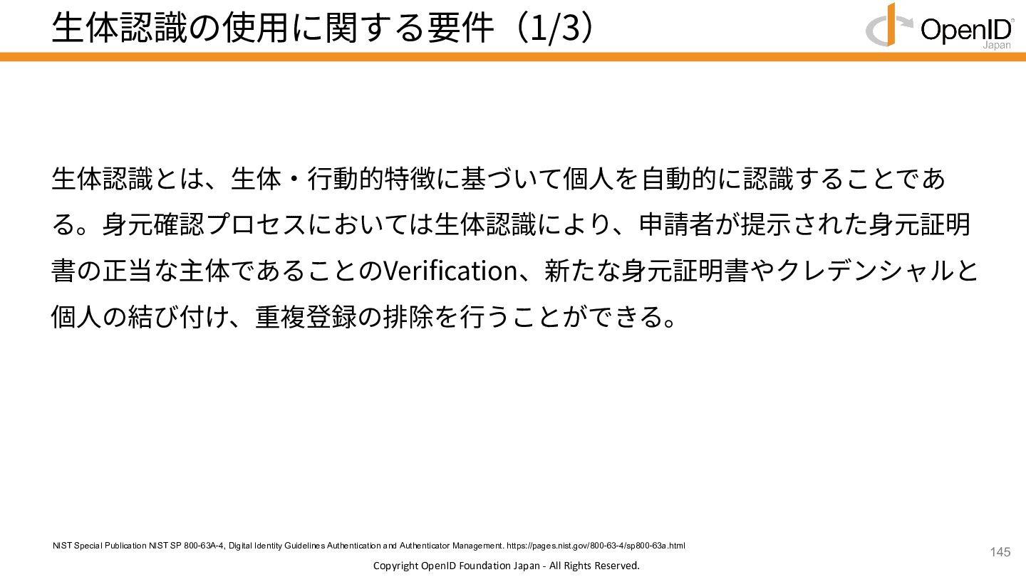 133. Copyright OpenID Foundation Japan - All Rights Reserved. ⽣体認識の使⽤に関する要件(1/3) ⽣体認識とは、⽣体‧⾏動的特徴に基づいて個⼈を⾃動的に認識することであ