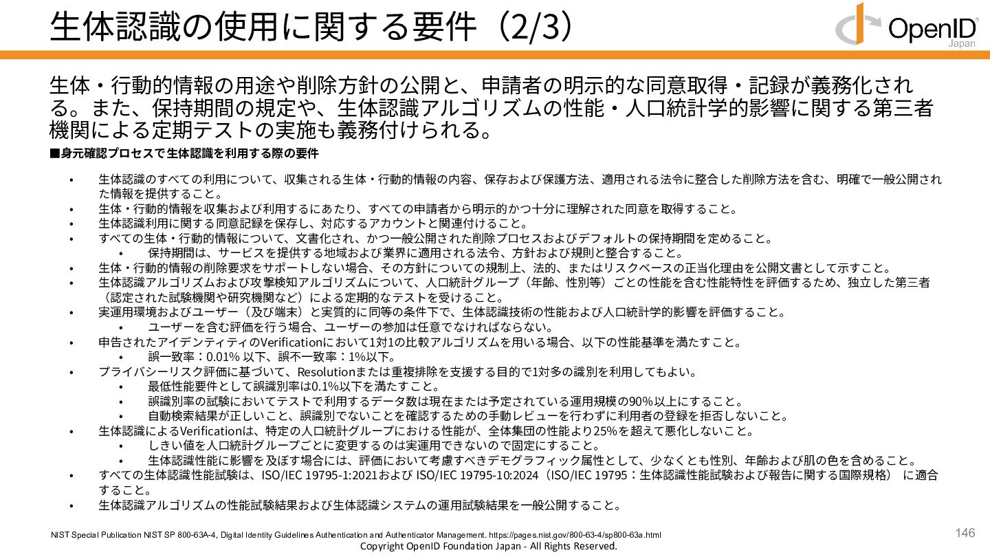 ⽣体認識のすべての利⽤について、収集される⽣体‧⾏動的情報の内容、保存および保護⽅法、適⽤される法令に整合した削除⽅法を含む、明確で⼀般公開され た情報を提供すること。 • ⽣体‧⾏動的情報を収集および利⽤するにあたり、すべての申請者から明⽰的かつ⼗分に理解された同意を取得すること。 • ⽣体認識利⽤に関する同意記録を保存し、対応するアカウントと関連付けること。 • すべての⽣体‧⾏動的情報について、⽂書化され、かつ⼀般公開された削除プロセスおよびデフォルトの保持期間を定めること。 • 保持期間は、サービスを提供する地域および業界に適⽤される法令、⽅針および規則と整合すること。 • ⽣体‧⾏動的情報の削除要求をサポートしない場合、その⽅針についての規制上、法的、またはリスクベースの正当化理由を公開⽂書として⽰すこと。 • ⽣体認識アルゴリズムおよび攻撃検知アルゴリズムについて、⼈⼝統計グループ(年齢、性別等)ごとの性能を含む性能特性を評価するため、独⽴した第三者 (認定された試験機関や研究機関など)による定期的なテストを受けること。 • 実運⽤環境およびユーザー(及び端末)と実質的に同等の条件下で、⽣体認識技術の性能および⼈⼝統計学的影響を評価すること。 • ユーザーを含む評価を⾏う場合、ユーザーの参加は任意でなければならない。 • 申告されたアイデンティティのVerificationにおいて1対1の⽐較アルゴリズムを⽤いる場合、以下の性能基準を満たすこと。 • 誤⼀致率:0.01% 以下、誤不⼀致率:1%以下。 • プライバシーリスク評価に基づいて、Resolutionまたは重複排除を⽀援する⽬的で1対多の識別を利⽤してもよい。 • 最低性能要件として誤識別率は0.1%以下を満たすこと。 • 誤識別率の試験においてテストで利⽤するデータ数は現在または予定されている運⽤規模の90%以上にすること。 • ⾃動検索結果が正しいこと、誤識別でないことを確認するための⼿動レビューを⾏わずに利⽤者の登録を拒否しないこと。 • ⽣体認識によるVerificationは、特定の⼈⼝統計グループにおける性能が、全体集団の性能より25%を超えて悪化しないこと。 • しきい値を⼈⼝統計グループごとに変更するのは実運⽤できないので固定にすること。 • ⽣体認識性能に影響を及ぼす場合には、評価において考慮すべきデモグラフィック属性として、少なくとも性別、年齢および肌の⾊を含めること。 • すべての⽣体認識性能試験は、ISO/IEC 19795-1:2021および ISO/IEC 19795-10:2024(ISO/IEC 19795:⽣体認識性能試験および報告に関する国際規格) に適合 すること。 • ⽣体認識アルゴリズムの性能試験結果および⽣体認識システムの運⽤試験結果を⼀般公開すること。 ⽣体認識の使⽤に関する要件(2/3) ⽣体‧⾏動的情報の⽤途や削除⽅針の公開と、申請者の明⽰的な同意取得‧記録が義務化され る。また、保持期間の規定や、⽣体認識アルゴリズムの性能‧⼈⼝統計学的影響に関する第三者 機関による定期テストの実施も義務付けられる。 146 NIST Special Publication NIST SP 800-63A-4, Digital Identity Guidelines Authentication and Authenticator Management. https://pages.nist.gov/800-63-4/sp800-63a.html