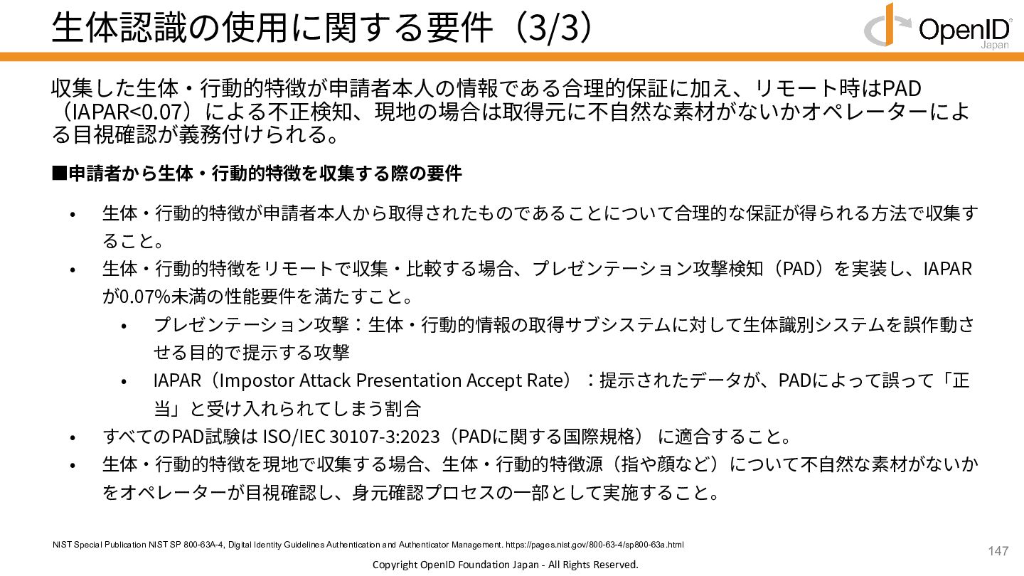 • ⽣体‧⾏動的特徴が申請者本⼈から取得されたものであることについて合理的な保証が得られる⽅法で収集す ること。 • ⽣体‧⾏動的特徴をリモートで収集‧⽐較する場合、プレゼンテーション攻撃検知(PAD)を実装し、IAPAR が0.07%未満の性能要件を満たすこと。 • プレゼンテーション攻撃:⽣体‧⾏動的情報の取得サブシステムに対して⽣体識別システムを誤作動さ せる⽬的で提⽰する攻撃 • IAPAR(Impostor Attack Presentation Accept Rate):提⽰されたデータが、PADによって誤って「正 当」と受け⼊れられてしまう割合 • すべてのPAD試験は ISO/IEC 30107-3:2023(PADに関する国際規格) に適合すること。 • ⽣体‧⾏動的特徴を現地で収集する場合、⽣体‧⾏動的特徴源(指や顔など)について不⾃然な素材がないか をオペレーターが⽬視確認し、⾝元確認プロセスの⼀部として実施すること。 収集した⽣体‧⾏動的特徴が申請者本⼈の情報である合理的保証に加え、リモート時はPAD (IAPAR<0.07)による不正検知、現地の場合は取得元に不⾃然な素材がないかオペレーターによ る⽬視確認が義務付けられる。 147 NIST Special Publication NIST SP 800-63A-4, Digital Identity Guidelines Authentication and Authenticator Management. https://pages.nist.gov/800-63-4/sp800-63a.html