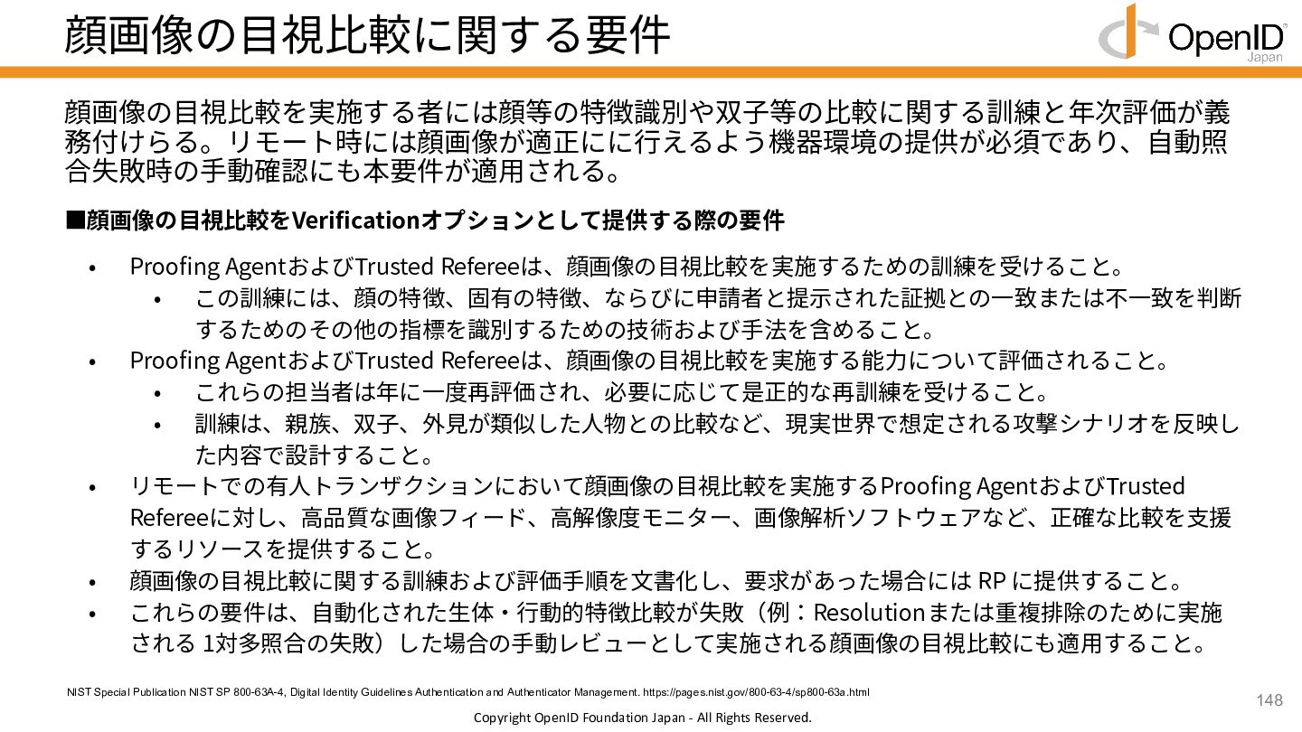 • Proofing AgentおよびTrusted Refereeは、顔画像の⽬視⽐較を実施するための訓練を受けること。 • この訓練には、顔の特徴、固有の特徴、ならびに申請者と提⽰された証拠との⼀致または不⼀致を判断 するためのその他の指標を識別するための技術および⼿法を含めること。 • Proofing AgentおよびTrusted Refereeは、顔画像の⽬視⽐較を実施する能⼒について評価されること。 • これらの担当者は年に⼀度再評価され、必要に応じて是正的な再訓練を受けること。 • 訓練は、親族、双⼦、外⾒が類似した⼈物との⽐較など、現実世界で想定される攻撃シナリオを反映し た内容で設計すること。 • リモートでの有⼈トランザクションにおいて顔画像の⽬視⽐較を実施するProofing AgentおよびTrusted Refereeに対し、⾼品質な画像フィード、⾼解像度モニター、画像解析ソフトウェアなど、正確な⽐較を⽀援 するリソースを提供すること。 • 顔画像の⽬視⽐較に関する訓練および評価⼿順を⽂書化し、要求があった場合には RP に提供すること。 • これらの要件は、⾃動化された⽣体‧⾏動的特徴⽐較が失敗(例:Resolutionまたは重複排除のために実施 される 1対多照合の失敗)した場合の⼿動レビューとして実施される顔画像の⽬視⽐較にも適⽤すること。 顔画像の⽬視⽐較を実施する者には顔等の特徴識別や双⼦等の⽐較に関する訓練と年次評価が義 務付けらる。リモート時には顔画像が適正にに⾏えるよう機器環境の提供が必須であり、⾃動照 合失敗時の⼿動確認にも本要件が適⽤される。 148 NIST Special Publication NIST SP 800-63A-4, Digital Identity Guidelines Authentication and Authenticator Management. https://pages.nist.gov/800-63-4/sp800-63a.html
