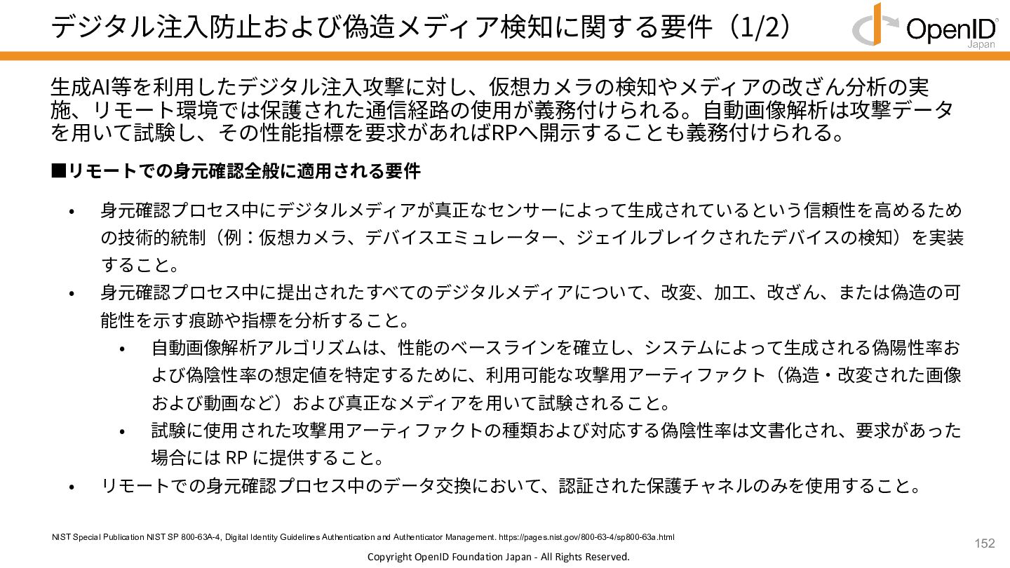 • ⾝元確認プロセス中にデジタルメディアが真正なセンサーによって⽣成されているという信頼性を⾼めるため の技術的統制(例:仮想カメラ、デバイスエミュレーター、ジェイルブレイクされたデバイスの検知)を実装 すること。 • ⾝元確認プロセス中に提出されたすべてのデジタルメディアについて、改変、加⼯、改ざん、または偽造の可 能性を⽰す痕跡や指標を分析すること。 • ⾃動画像解析アルゴリズムは、性能のベースラインを確⽴し、システムによって⽣成される偽陽性率お よび偽陰性率の想定値を特定するために、利⽤可能な攻撃⽤アーティファクト(偽造‧改変された画像 および動画など)および真正なメディアを⽤いて試験されること。 • 試験に使⽤された攻撃⽤アーティファクトの種類および対応する偽陰性率は⽂書化され、要求があった 場合には RP に提供すること。 • リモートでの⾝元確認プロセス中のデータ交換において、認証された保護チャネルのみを使⽤すること。 ⽣成AI等を利⽤したデジタル注⼊攻撃に対し、仮想カメラの検知やメディアの改ざん分析の実 施、リモート環境では保護された通信経路の使⽤が義務付けられる。⾃動画像解析は攻撃データ を⽤いて試験し、その性能指標を要求があればRPへ開⽰することも義務付けられる。 152 NIST Special Publication NIST SP 800-63A-4, Digital Identity Guidelines Authentication and Authenticator Management. https://pages.nist.gov/800-63-4/sp800-63a.html