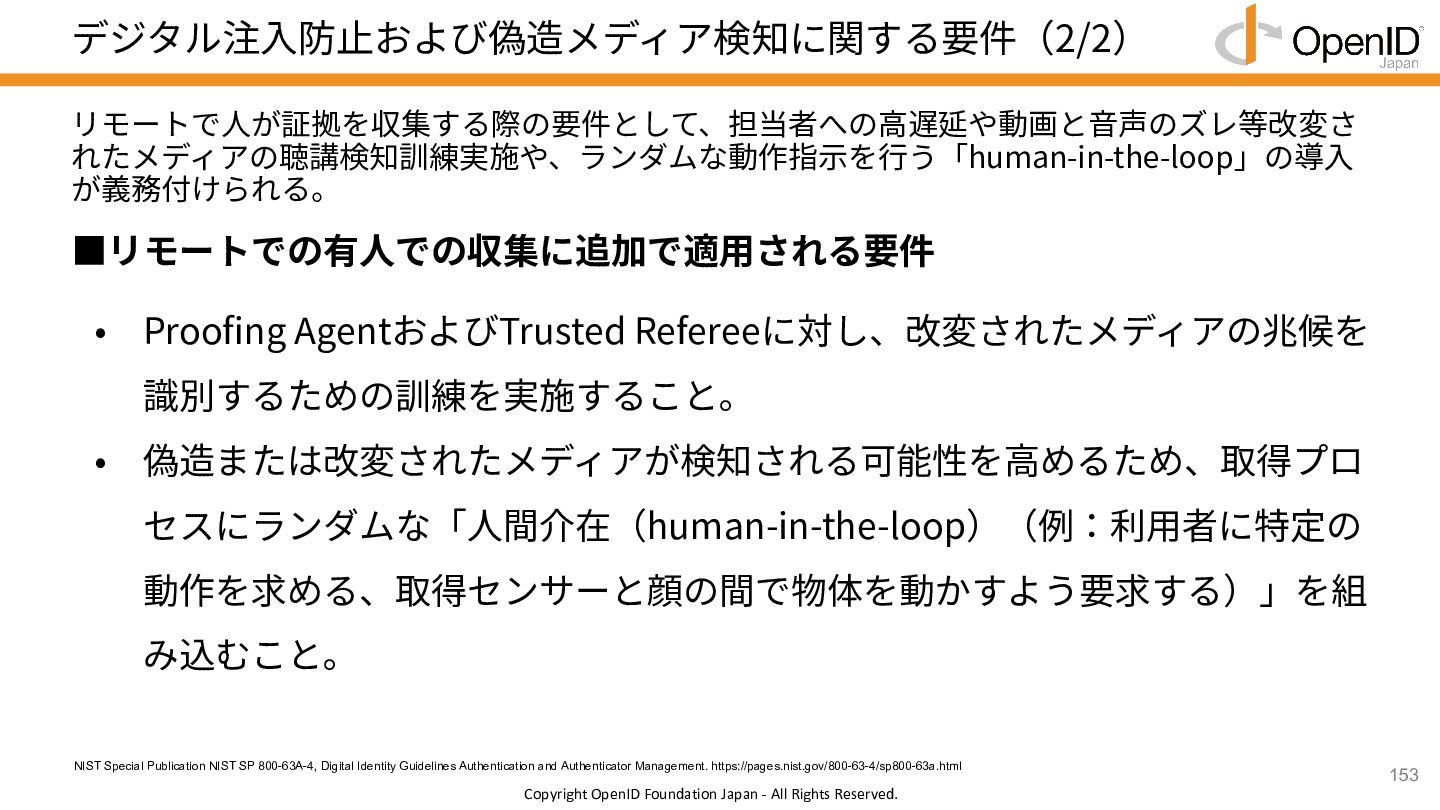 141. Copyright OpenID Foundation Japan - All Rights Reserved. リモートで⼈が証拠を収集する際の要件として、担当者への⾼遅延や動画と⾳声のズレ等改変さ れたメディアの聴講検知訓練実施や、ランダムな動作指⽰を⾏う「human-in-the-loop」の導⼊