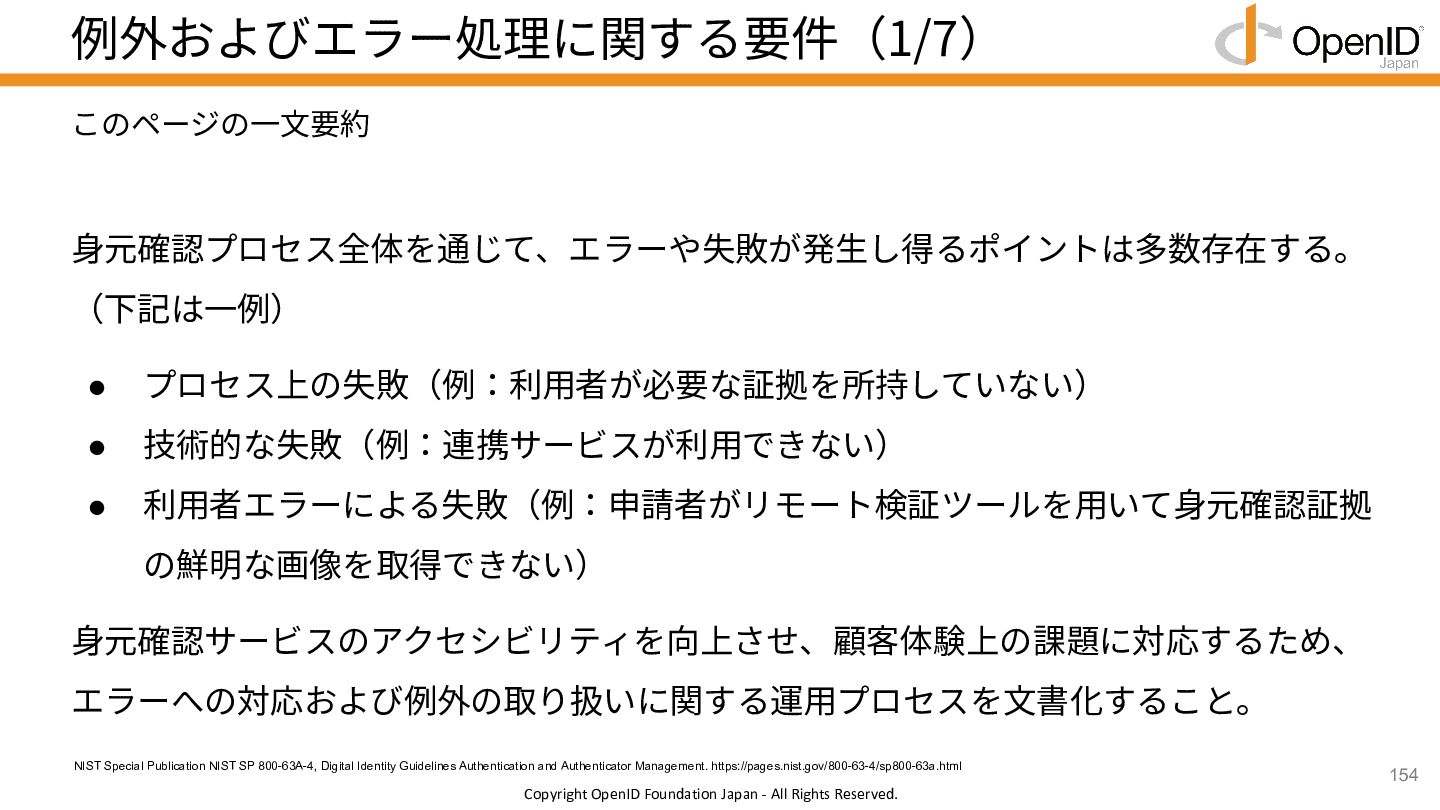 142. Copyright OpenID Foundation Japan - All Rights Reserved. 例外およびエラー処理に関する要件(1/7) ⾝元確認プロセス全体を通じて、エラーや失敗が発⽣し得るポイントは多数存在する。