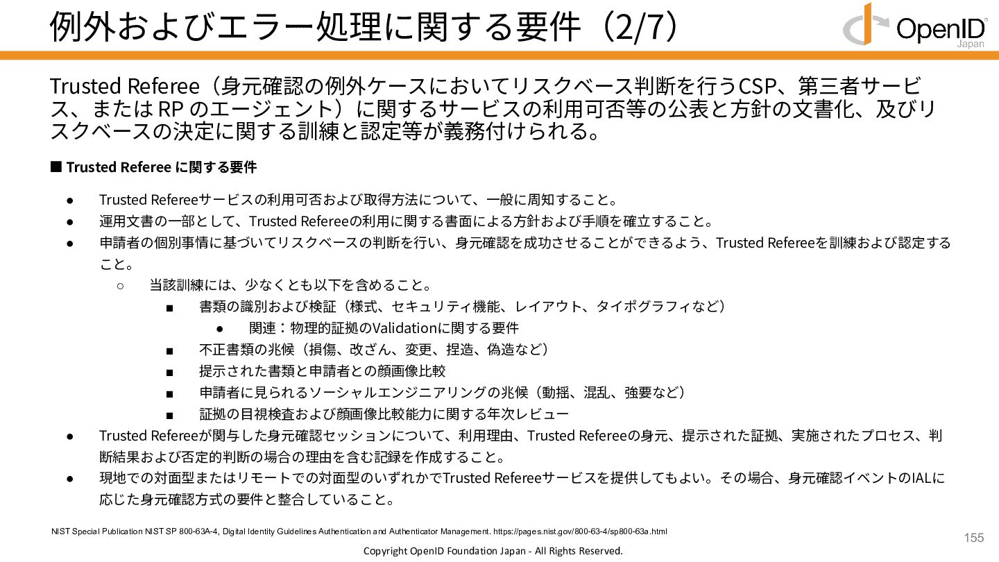 Referee に関する要件 • Trusted Refereeサービスの利⽤可否および取得⽅法について、⼀般に周知すること。 • 運⽤⽂書の⼀部として、Trusted Refereeの利⽤に関する書⾯による⽅針および⼿順を確⽴すること。 • 申請者の個別事情に基づいてリスクベースの判断を⾏い、⾝元確認を成功させることができるよう、Trusted Refereeを訓練および認定する こと。 ◦ 当該訓練には、少なくとも以下を含めること。 ▪ 書類の識別および検証(様式、セキュリティ機能、レイアウト、タイポグラフィなど) • 関連:物理的証拠のValidationに関する要件 ▪ 不正書類の兆候(損傷、改ざん、変更、捏造、偽造など) ▪ 提⽰された書類と申請者との顔画像⽐較 ▪ 申請者に⾒られるソーシャルエンジニアリングの兆候(動揺、混乱、強要など) ▪ 証拠の⽬視検査および顔画像⽐較能⼒に関する年次レビュー • Trusted Refereeが関与した⾝元確認セッションについて、利⽤理由、Trusted Refereeの⾝元、提⽰された証拠、実施されたプロセス、判 断結果および否定的判断の場合の理由を含む記録を作成すること。 • 現地での対⾯型またはリモートでの対⾯型のいずれかでTrusted Refereeサービスを提供してもよい。その場合、⾝元確認イベントのIALに 応じた⾝元確認⽅式の要件と整合していること。 例外およびエラー処理に関する要件(2/7) Trusted Referee(⾝元確認の例外ケースにおいてリスクベース判断を⾏うCSP、第三者サービ ス、または RP のエージェント)に関するサービスの利⽤可否等の公表と⽅針の⽂書化、及びリ スクベースの決定に関する訓練と認定等が義務付けられる。 155 NIST Special Publication NIST SP 800-63A-4, Digital Identity Guidelines Authentication and Authenticator Management. https://pages.nist.gov/800-63-4/sp800-63a.html