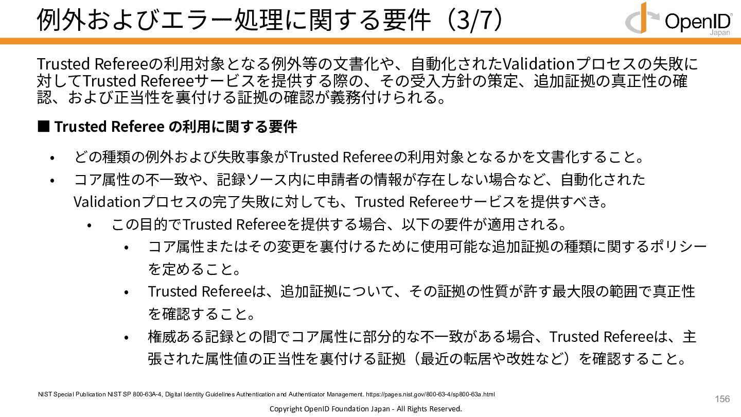 Referee の利⽤に関する要件 • どの種類の例外および失敗事象がTrusted Refereeの利⽤対象となるかを⽂書化すること。 • コア属性の不⼀致や、記録ソース内に申請者の情報が存在しない場合など、⾃動化された Validationプロセスの完了失敗に対しても、Trusted Refereeサービスを提供すべき。 • この⽬的でTrusted Refereeを提供する場合、以下の要件が適⽤される。 • コア属性またはその変更を裏付けるために使⽤可能な追加証拠の種類に関するポリシー を定めること。 • Trusted Refereeは、追加証拠について、その証拠の性質が許す最⼤限の範囲で真正性 を確認すること。 • 権威ある記録との間でコア属性に部分的な不⼀致がある場合、Trusted Refereeは、主 張された属性値の正当性を裏付ける証拠(最近の転居や改姓など)を確認すること。 例外およびエラー処理に関する要件(3/7) Trusted Refereeの利⽤対象となる例外等の⽂書化や、⾃動化されたValidationプロセスの失敗に 対してTrusted Refereeサービスを提供する際の、その受⼊⽅針の策定、追加証拠の真正性の確 認、および正当性を裏付ける証拠の確認が義務付けられる。 156 NIST Special Publication NIST SP 800-63A-4, Digital Identity Guidelines Authentication and Authenticator Management. https://pages.nist.gov/800-63-4/sp800-63a.html