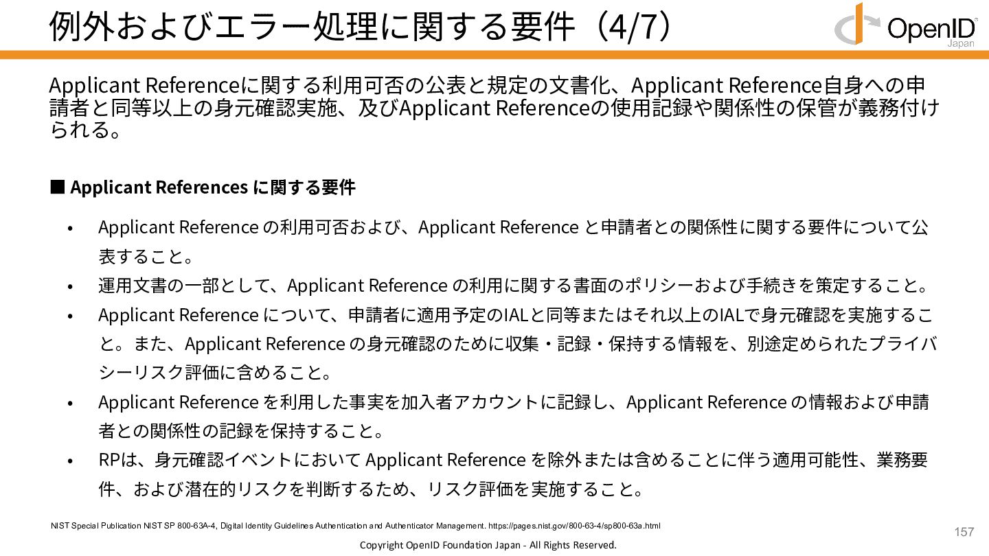 References に関する要件 • Applicant Reference の利⽤可否および、Applicant Reference と申請者との関係性に関する要件について公 表すること。 • 運⽤⽂書の⼀部として、Applicant Reference の利⽤に関する書⾯のポリシーおよび⼿続きを策定すること。 • Applicant Reference について、申請者に適⽤予定のIALと同等またはそれ以上のIALで⾝元確認を実施するこ と。また、Applicant Reference の⾝元確認のために収集‧記録‧保持する情報を、別途定められたプライバ シーリスク評価に含めること。 • Applicant Reference を利⽤した事実を加⼊者アカウントに記録し、Applicant Reference の情報および申請 者との関係性の記録を保持すること。 • RPは、⾝元確認イベントにおいて Applicant Reference を除外または含めることに伴う適⽤可能性、業務要 件、および潜在的リスクを判断するため、リスク評価を実施すること。 例外およびエラー処理に関する要件(4/7) Applicant Referenceに関する利⽤可否の公表と規定の⽂書化、Applicant Reference⾃⾝への申 請者と同等以上の⾝元確認実施、及びApplicant Referenceの使⽤記録や関係性の保管が義務付け られる。 157 NIST Special Publication NIST SP 800-63A-4, Digital Identity Guidelines Authentication and Authenticator Management. https://pages.nist.gov/800-63-4/sp800-63a.html