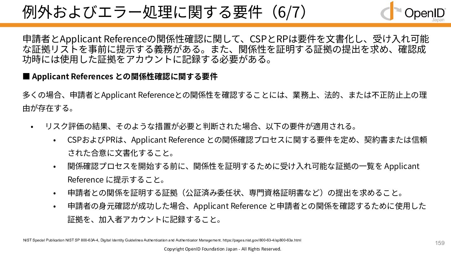 References の利⽤に関する要件 • Applicant Reference の利⽤を認める場合、CSPおよびそのサービスを利⽤するRPは、Applicant Reference に関する許容されるすべての利 ⽤⽅法を、契約書または信頼された合意⽂書に⽂書化すること。 • Applicant Reference は、以下を⾏ってよい。 • 証拠および属性Validationの⼀環として、申請者が主張する1つまたは複数のコア属性について保証すること。 • ⼗分な⾝元確認証拠が存在しない場合に、申請者の⾝元を保証すること。 • ⾝元確認プロセスに関連する特定の状況または状態(ホームレス状態、災害被災状況など)について保証すること。 *これらの情報は、⾝元確認イベントに関連するリスク判断を⽀援することを⽬的としている。Applicant Reference の陳述を、資格や給付の適格 性を確⽴する⽬的で使⽤することは、本ガイドラインの範囲外である。 • すべての場合において、Applicant Reference がプロセス内で果たした役割の記録を作成し、適⽤される法令‧規制要件を満たすのに⼗分な 形でその⾏為を⽂書化すること。 • Applicant Reference として参加することによって⽣じ得る法的および責任上の影響について、明確かつ理解しやすい情報をApplicant Reference に提供すること。 例外およびエラー処理に関する要件(5/7) Applicant Reference の利⽤において利⽤可能なユースケース等を契約等に⽂書化し、その役割と ⾏動を記録する義務がある。また、Applicant Reference に対し、参加に伴う法的責任や影響につ いて明確な情報を提供することも義務付けられる。 158 NIST Special Publication NIST SP 800-63A-4, Digital Identity Guidelines Authentication and Authenticator Management. https://pages.nist.gov/800-63-4/sp800-63a.html