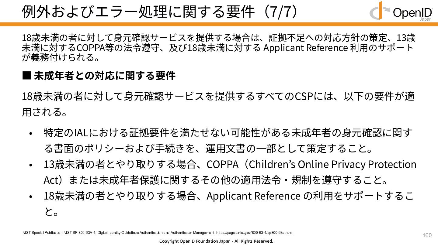 18歳未満の者に対して⾝元確認サービスを提供するすべてのCSPには、以下の要件が適 ⽤される。 • 特定のIALにおける証拠要件を満たせない可能性がある未成年者の⾝元確認に関す る書⾯のポリシーおよび⼿続きを、運⽤⽂書の⼀部として策定すること。 • 13歳未満の者とやり取りする場合、COPPA(Children’s Online Privacy Protection Act)または未成年者保護に関するその他の適⽤法令‧規制を遵守すること。 • 18歳未満の者とやり取りする場合、Applicant Reference の利⽤をサポートするこ と。 例外およびエラー処理に関する要件(7/7) 18歳未満の者に対して⾝元確認サービスを提供する場合は、証拠不⾜への対応⽅針の策定、13歳 未満に対するCOPPA等の法令遵守、及び18歳未満に対する Applicant Reference 利⽤のサポート が義務付けられる。 160 NIST Special Publication NIST SP 800-63A-4, Digital Identity Guidelines Authentication and Authenticator Management. https://pages.nist.gov/800-63-4/sp800-63a.html