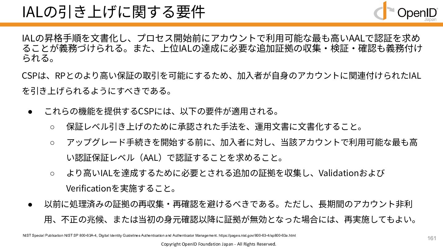 を引き上げられるようにすべきである。 • これらの機能を提供するCSPには、以下の要件が適⽤される。 ◦ 保証レベル引き上げのために承認された⼿法を、運⽤⽂書に⽂書化すること。 ◦ アップグレード⼿続きを開始する前に、加⼊者に対し、当該アカウントで利⽤可能な最も⾼ い認証保証レベル(AAL)で認証することを求めること。 ◦ より⾼いIALを達成するために必要とされる追加の証拠を収集し、Validationおよび Verificationを実施すること。 • 以前に処理済みの証拠の再収集‧再確認を避けるべきである。ただし、⻑期間のアカウント⾮利 ⽤、不正の兆候、または当初の⾝元確認以降に証拠が無効となった場合には、再実施してもよい。 IALの昇格⼿順を⽂書化し、プロセス開始前にアカウントで利⽤可能な最も⾼いAALで認証を求め ることが義務づけられる。また、上位IALの達成に必要な追加証拠の収集‧検証‧確認も義務付け られる。 161 NIST Special Publication NIST SP 800-63A-4, Digital Identity Guidelines Authentication and Authenticator Management. https://pages.nist.gov/800-63-4/sp800-63a.html