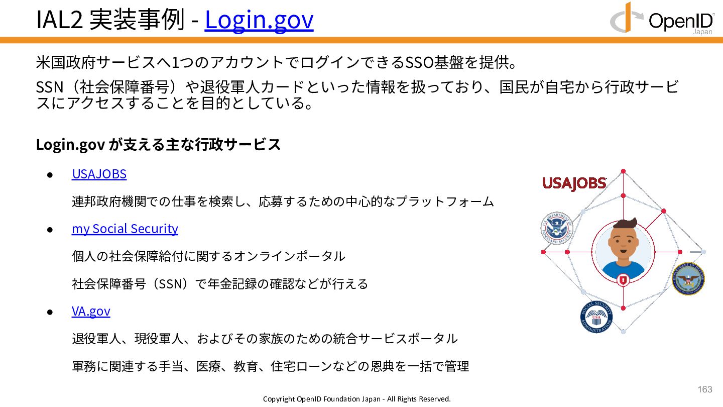 - Login.gov ⽶国政府サービスへ1つのアカウントでログインできるSSO基盤を提供。 SSN(社会保障番号)や退役軍⼈カードといった情報を扱っており、国⺠が⾃宅から⾏政サービ スにアクセスすることを⽬的としている。 163 Login.gov が⽀える主な⾏政サービス • USAJOBS 連邦政府機関での仕事を検索し、応募するための中⼼的なプラットフォーム • my Social Security 個⼈の社会保障給付に関するオンラインポータル 社会保障番号(SSN)で年⾦記録の確認などが⾏える • VA.gov 退役軍⼈、現役軍⼈、およびその家族のための統合サービスポータル 軍務に関連する⼿当、医療、教育、住宅ローンなどの恩典を⼀括で管理