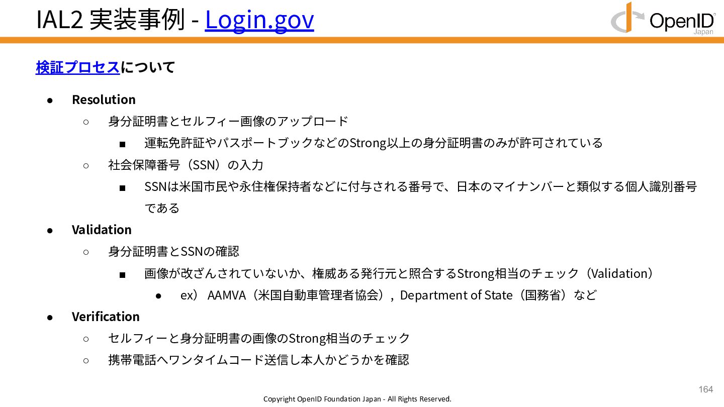 - Login.gov 164 検証プロセスについて • Resolution ◦ ⾝分証明書とセルフィー画像のアップロード ▪ 運転免許証やパスポートブックなどのStrong以上の⾝分証明書のみが許可されている ◦ 社会保障番号(SSN)の⼊⼒ ▪ SSNは⽶国市⺠や永住権保持者などに付与される番号で、⽇本のマイナンバーと類似する個⼈識別番号 である • Validation ◦ ⾝分証明書とSSNの確認 ▪ 画像が改ざんされていないか、権威ある発⾏元と照合するStrong相当のチェック(Validation) • ex) AAMVA(⽶国⾃動⾞管理者協会), Department of State(国務省)など • Verification ◦ セルフィーと⾝分証明書の画像のStrong相当のチェック ◦ 携帯電話へワンタイムコード送信し本⼈かどうかを確認