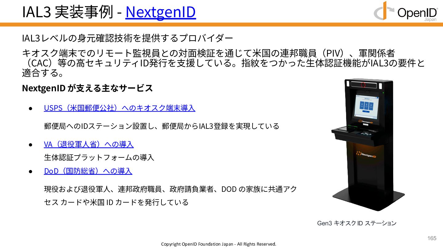 - NextgenID IAL3レベルの⾝元確認技術を提供するプロバイダー キオスク端末でのリモート監視員との対⾯検証を通じて⽶国の連邦職員(PIV)、軍関係者 (CAC)等の⾼セキュリティID発⾏を⽀援している。指紋をつかった⽣体認証機能がIAL3の要件と 適合する。 165 NextgenID が⽀える主なサービス • USPS(⽶国郵便公社)へのキオスク端末導⼊ 郵便局へのIDステーション設置し、郵便局からIAL3登録を実現している • VA(退役軍⼈省)への導⼊ ⽣体認証プラットフォームの導⼊ • DoD(国防総省)への導⼊ 現役および退役軍⼈、連邦政府職員、政府請負業者、DOD の家族に共通アク セス カードや⽶国 ID カードを発⾏している Gen3 キオスク ID ステーション