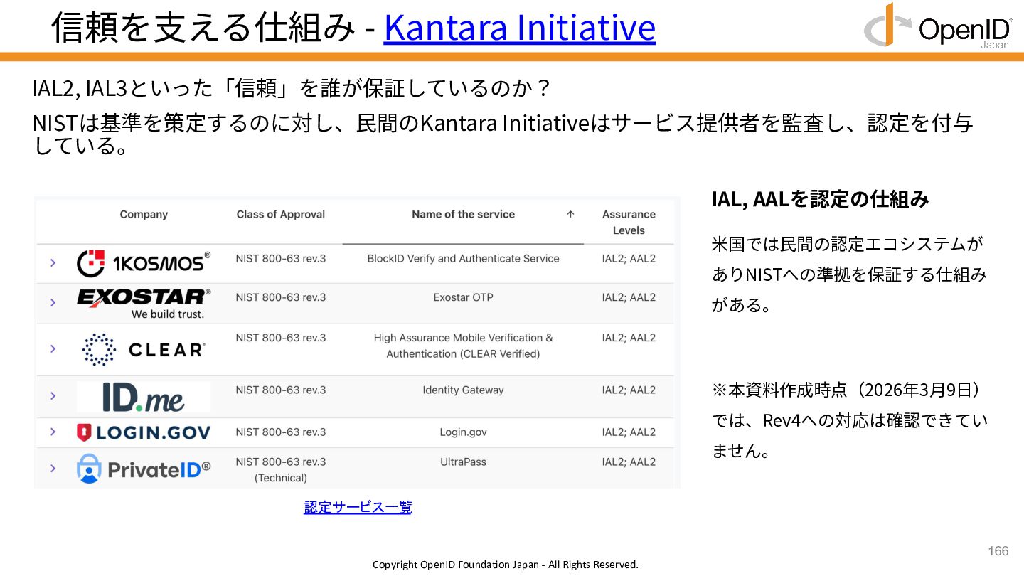 Kantara Initiative IAL2, IAL3といった「信頼」を誰が保証しているのか? NISTは基準を策定するのに対し、⺠間のKantara Initiativeはサービス提供者を監査し、認定を付与 している。 166 IAL, AALを認定の仕組み ⽶国では⺠間の認定エコシステムが ありNISTへの準拠を保証する仕組み がある。 ※本資料作成時点(2026年3⽉9⽇) では、Rev4への対応は確認できてい ません。 認定サービス一覧