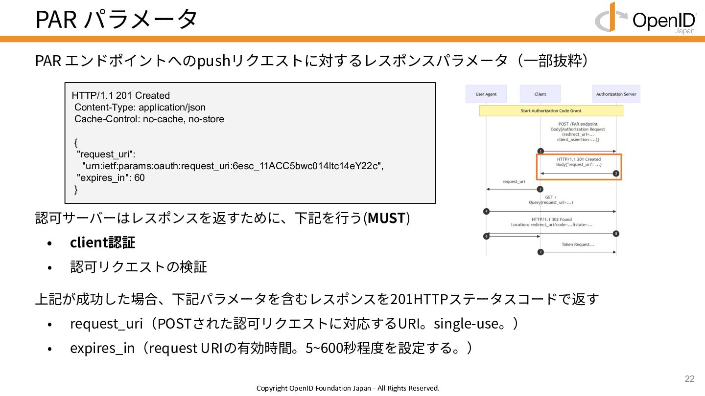 認可リクエスト含むパラメータをClientから“直接”認可サーバーへ送信(POST)する • PARエンドポイントURLはHTTPSスキーマを⽤いなければならない(MUST) • request_uriパラメータを含んではならない(MUST NOT) • client認証のために適切なパラメータを含む(e.g., clinet_secret, client_assertionとclient_assertion_type ) • PKCEと組み合わせることが可能(組み合わせ必須の記載はない) • requestパラメータをJWTにして送ってもよい(MAY) PAR エンドポイントへのpushリクエストパラメータ(⼀部抜粋) 21 POST /as/par HTTP/1.1 Host: as.example.com Content-Type: application/x-www-form-urlencoded response_type=code &state=af0ifjsldkj &client_id=s6BhdRkqt3 &redirect_uri=https%3A%2F%2Fclient.example.org%2Fcb &code_challenge=K2-ltc83acc4h0c9w6ESC_rEMTJ3bww-uCHaoeK1t8U &code_challenge_method=S256&scope=account-information &client_assertion_type=urn%3Aietf%3Aparams%3Aoauth%3Aclient-assertion-type%3Ajwt-bearer &client_assertion=eyJraWQi0.eyJpc3MiOiJz…jEicXTixEkdRuzsgUCm6GQ JWTにし、request = “JWT”にしてもよい