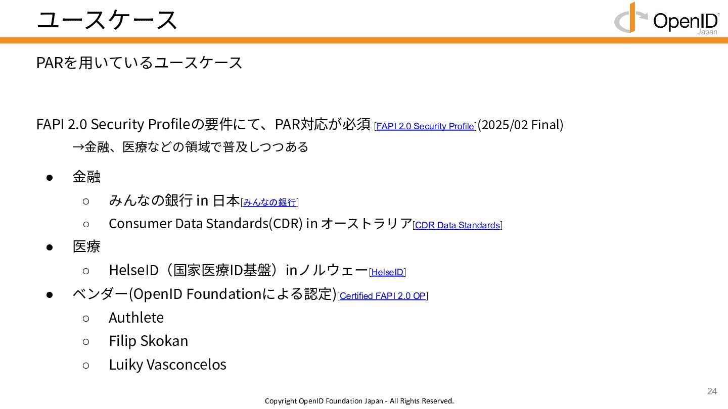 2.0 Security Profileの要件にて、PAR対応が必須 [FAPI 2.0 Security Profile](2025/02 Final) →⾦融、医療などの領域で普及しつつある • ⾦融 ◦ みんなの銀⾏ in ⽇本[みんなの銀行] ◦ Consumer Data Standards(CDR) in オーストラリア[CDR Data Standards] • 医療 ◦ HelseID(国家医療ID基盤)inノルウェー[HelseID] • ベンダー(OpenID Foundationによる認定)[Certified FAPI 2.0 OP] ◦ Authlete ◦ Filip Skokan ◦ Luiky Vasconcelos PARを⽤いているユースケース 24