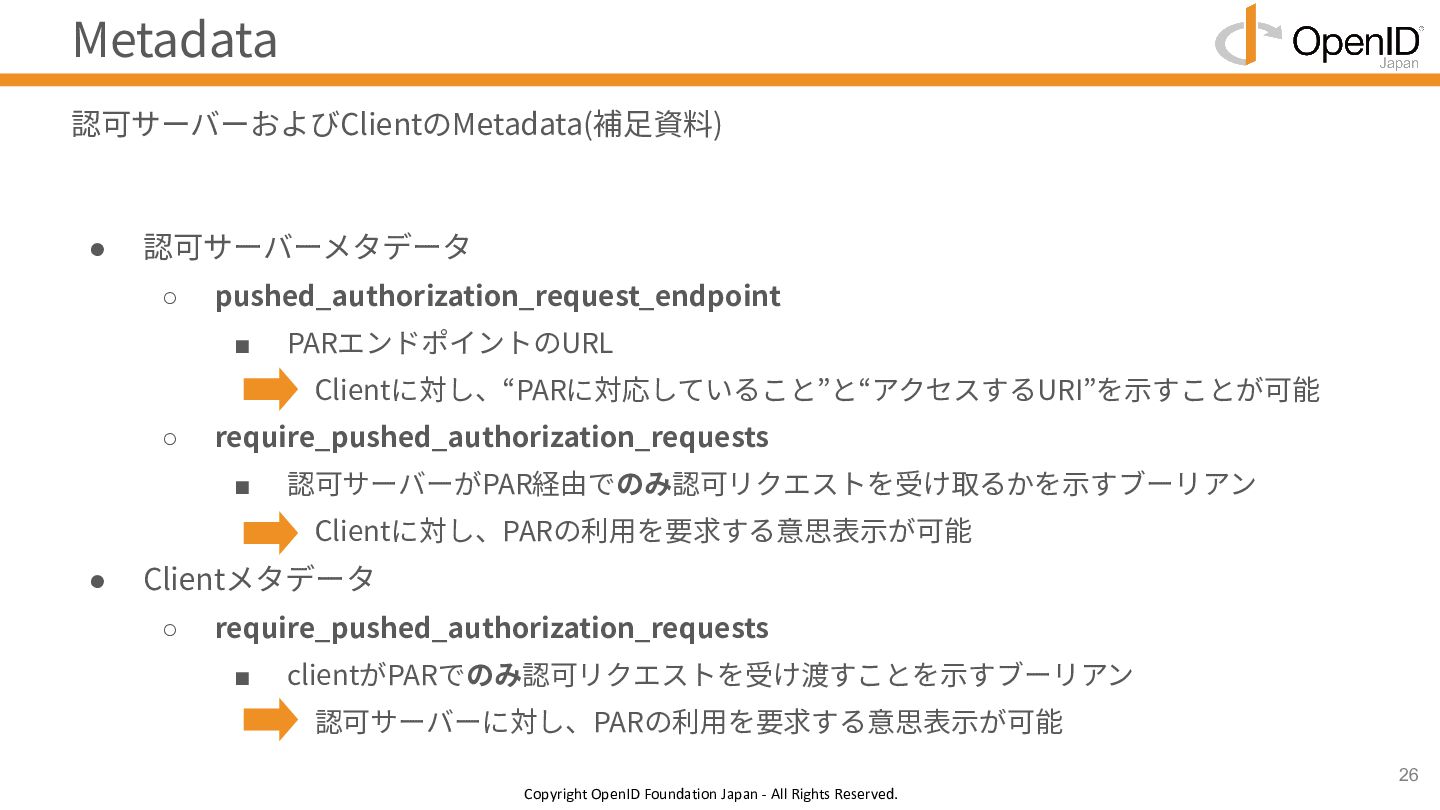 ◦ pushed_authorization_request_endpoint ▪ PARエンドポイントのURL  Clientに対し、“PARに対応していること”と“アクセスするURI”を⽰すことが可能 ◦ require_pushed_authorization_requests ▪ 認可サーバーがPAR経由でのみ認可リクエストを受け取るかを⽰すブーリアン  Clientに対し、PARの利⽤を要求する意思表⽰が可能 • Clientメタデータ ◦ require_pushed_authorization_requests ▪ clientがPARでのみ認可リクエストを受け渡すことを⽰すブーリアン  認可サーバーに対し、PARの利⽤を要求する意思表⽰が可能 認可サーバーおよびClientのMetadata(補⾜資料) 26 Metadata