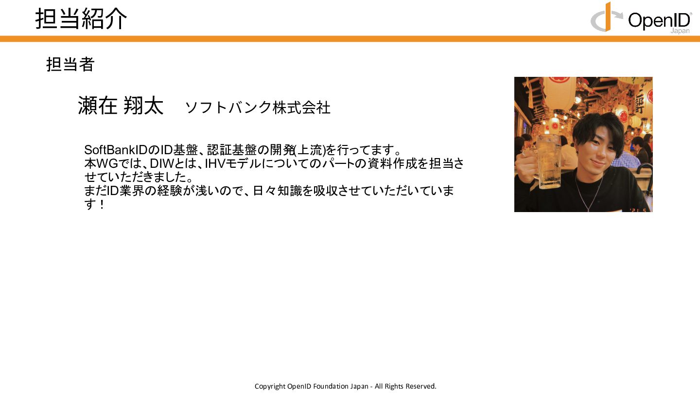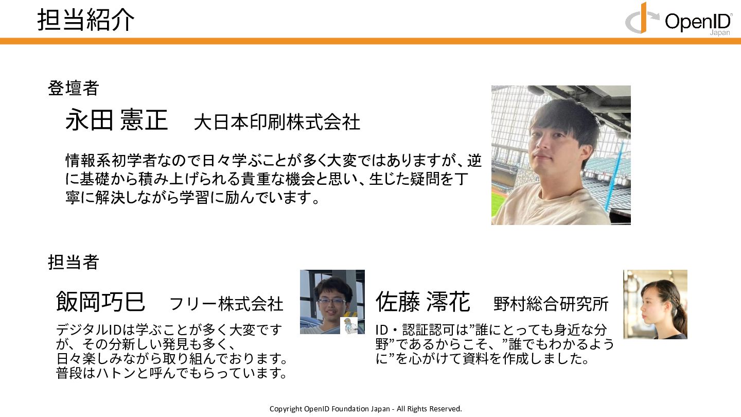 寧に解決しながら学習に励んでいます。 担当紹介 永⽥ 憲正 ⼤⽇本印刷株式会社 飯岡巧⺒ フリー株式会社 デジタルIDは学ぶことが多く⼤変です が、その分新しい発⾒も多く、 ⽇々楽しみながら取り組んでおります。 普段はハトンと呼んでもらっています。 登壇者 担当者 佐藤 澪花 野村総合研究所 ID‧認証認可は”誰にとっても⾝近な分 野”であるからこそ、”誰でもわかるよう に”を⼼がけて資料を作成しました。