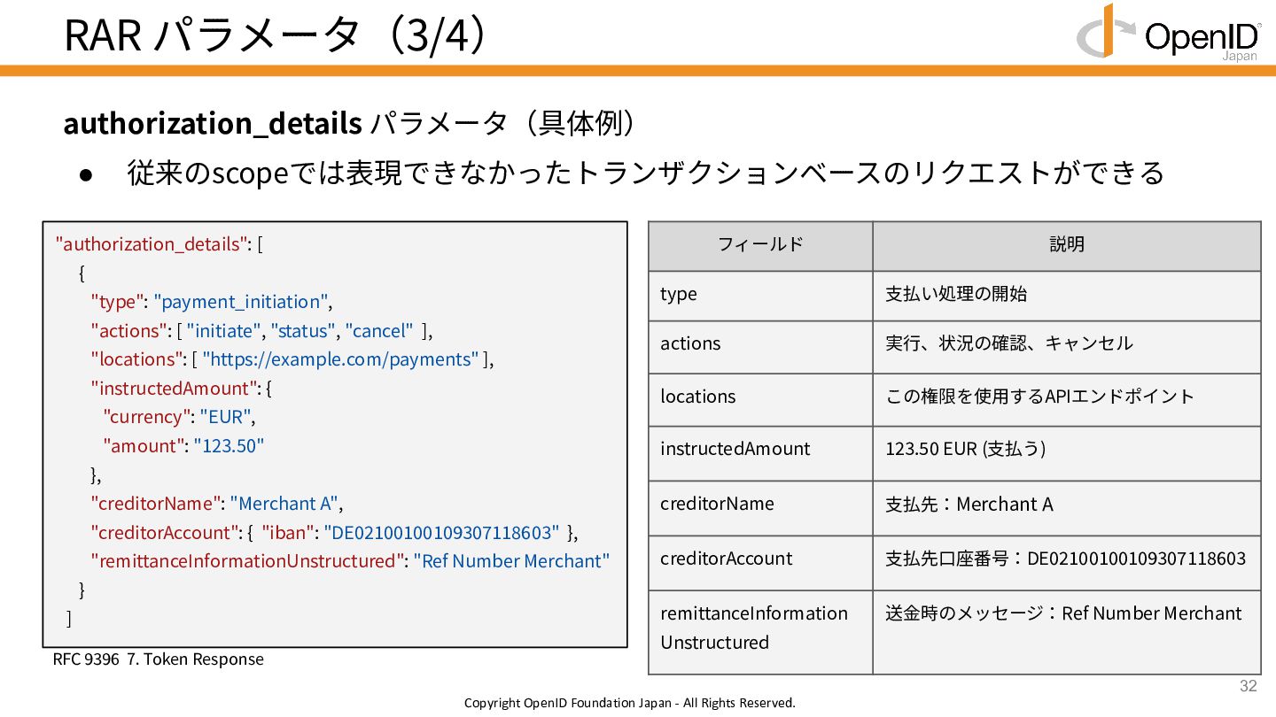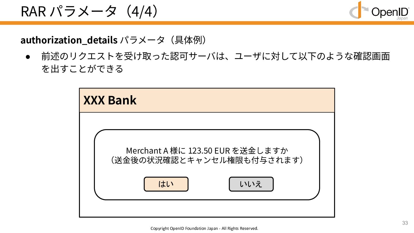 32 authorization_details パラメータ(具体例) • 従来のscopeでは表現できなかったトランザクションベースのリクエストができる "authorization_details": [ { "type": "payment_initiation", "actions": [ "initiate", "status", "cancel" ], "locations": [ "https://example.com/payments" ], "instructedAmount": { "currency": "EUR", "amount": "123.50" }, "creditorName": "Merchant A", "creditorAccount": { "iban": "DE02100100109307118603" }, "remittanceInformationUnstructured": "Ref Number Merchant" } ] フィールド 説明 type ⽀払い処理の開始 actions 実⾏、状況の確認、キャンセル locations この権限を使⽤するAPIエンドポイント instructedAmount 123.50 EUR (⽀払う) creditorName ⽀払先:Merchant A creditorAccount ⽀払先⼝座番号:DE02100100109307118603 remittanceInformation Unstructured 送⾦時のメッセージ:Ref Number Merchant RFC 9396 7. Token Response