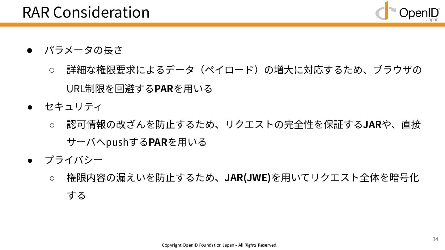 • パラメータの⻑さ ◦ 詳細な権限要求によるデータ(ペイロード)の増⼤に対応するため、ブラウザの URL制限を回避するPARを⽤いる • セキュリティ ◦ 認可情報の改ざんを防⽌するため、リクエストの完全性を保証するJARや、直接 サーバへpushするPARを⽤いる • プライバシー ◦ 権限内容の漏えいを防⽌するため、JAR(JWE)を⽤いてリクエスト全体を暗号化 する 34