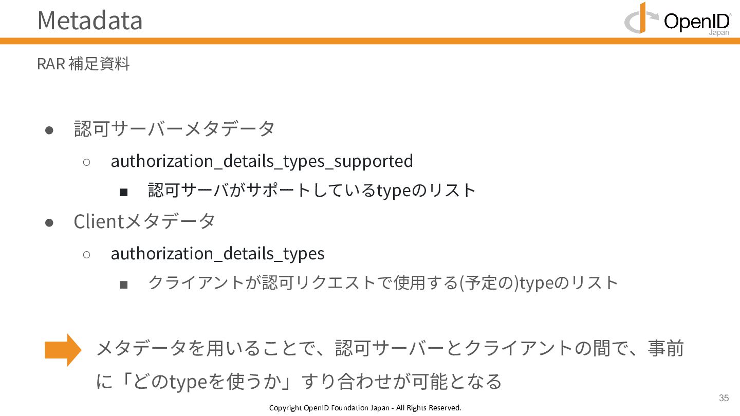 ◦ authorization_details_types_supported ▪ 認可サーバがサポートしているtypeのリスト • Clientメタデータ ◦ authorization_details_types ▪ クライアントが認可リクエストで使⽤する(予定の)typeのリスト RAR 補⾜資料 35 Metadata メタデータを⽤いることで、認可サーバーとクライアントの間で、事前 に「どのtypeを使うか」すり合わせが可能となる
