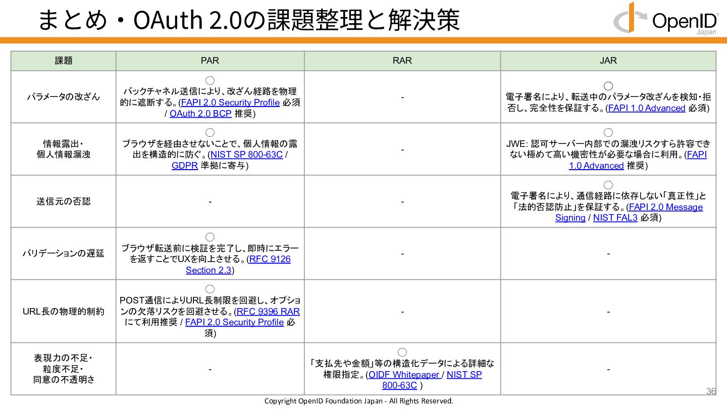 PAR RAR JAR パラメータの改ざん ◯ バックチャネル送信により、改ざん経路を物理 的に遮断する。(FAPI 2.0 Security Profile 必須 / OAuth 2.0 BCP 推奨) - ◯ 電子署名により、転送中のパラメータ改ざんを検知・拒 否し、完全性を保証する。(FAPI 1.0 Advanced 必須) 情報露出・ 個人情報漏洩 ◯ ブラウザを経由させないことで、個人情報の露 出を構造的に防ぐ。(NIST SP 800-63C / GDPR 準拠に寄与) - ◯ JWE: 認可サーバー内部での漏洩リスクすら許容でき ない極めて高い機密性が必要な場合に利用。(FAPI 1.0 Advanced 推奨) 送信元の否認 - - ◯ 電子署名により、通信経路に依存しない「真正性」と 「法的否認防止」を保証する。(FAPI 2.0 Message Signing / NIST FAL3 必須) バリデーションの遅延 ◯ ブラウザ転送前に検証を完了し、即時にエラー を返すことでUXを向上させる。(RFC 9126 Section 2.3) - - URL長の物理的制約 ◯ POST通信によりURL長制限を回避し、オプショ ンの欠落リスクを回避させる。(RFC 9396 RAR にて利用推奨 / FAPI 2.0 Security Profile 必 須) - - 表現力の不足・ 粒度不足・ 同意の不透明さ - ◯ 「支払先や金額」等の構造化データによる詳細な 権限指定。(OIDF Whitepaper / NIST SP 800-63C ) - まとめ‧OAuth 2.0の課題整理と解決策