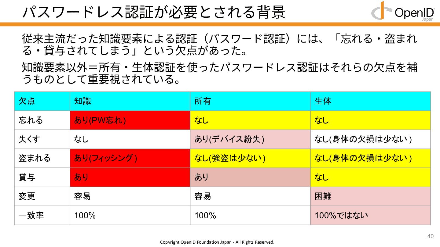 33. Copyright OpenID Foundation Japan - All Rights Reserved. パスワードレス認証が必要とされる背景 40