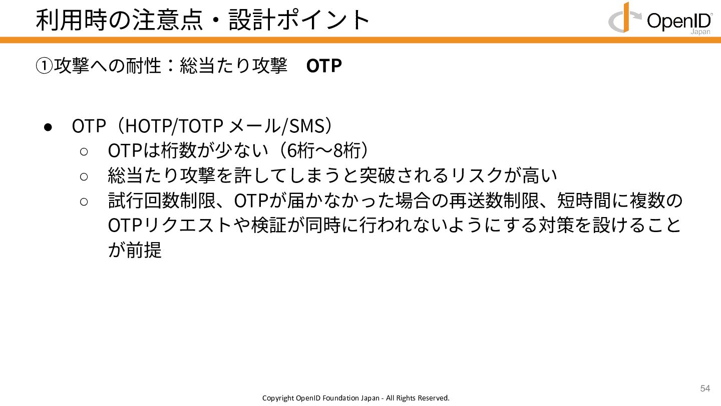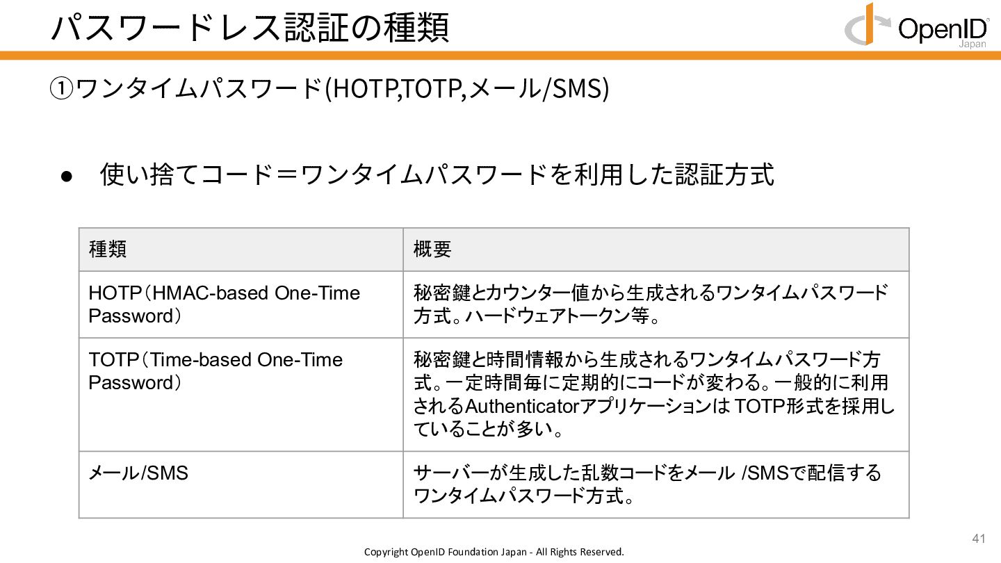 39. Copyright OpenID Foundation Japan - All Rights Reserved. パスワードレス認証のメリット‧デメリット ①ワンタイムパスワード(HOTP,TOTP,メール/SMS)を利⽤する場合
