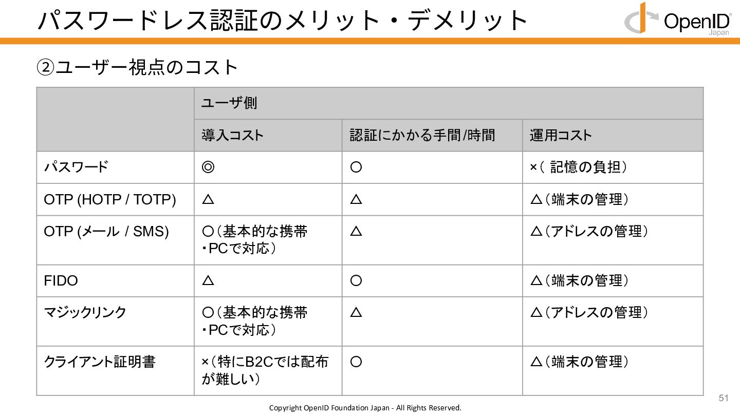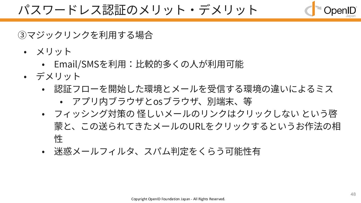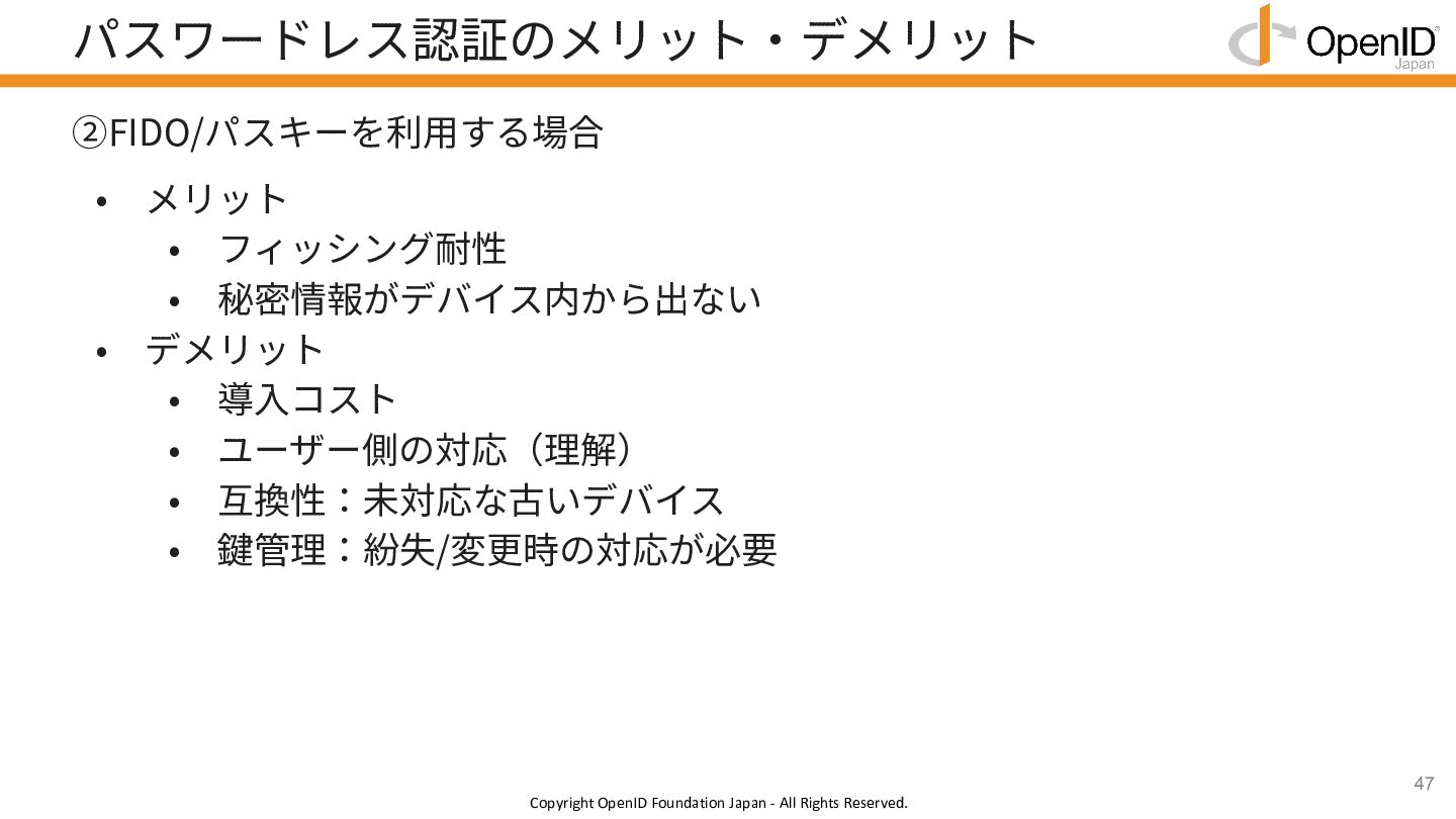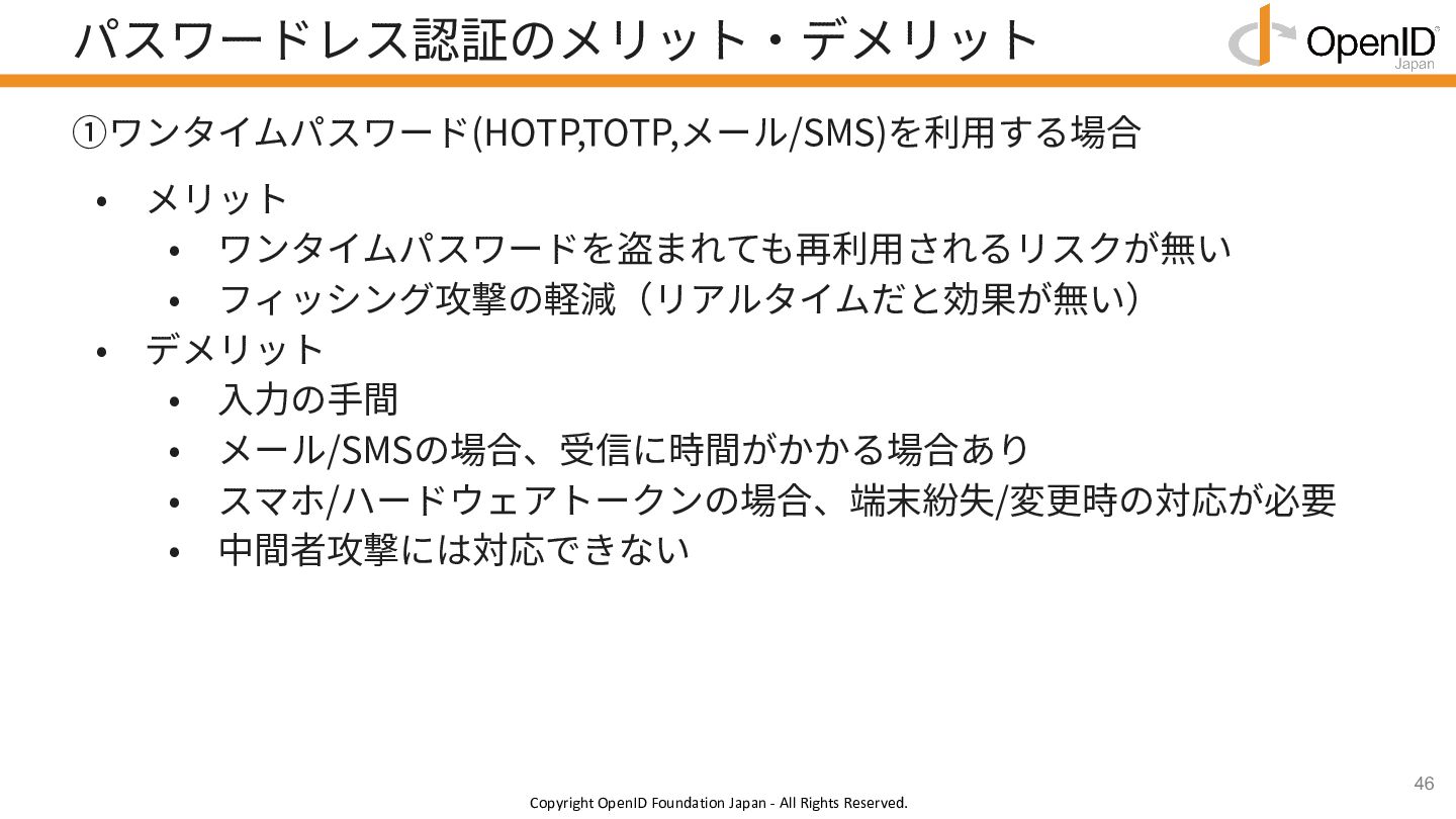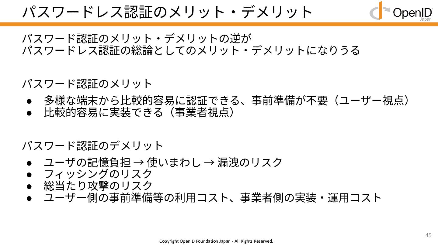 38. Copyright OpenID Foundation Japan - All Rights Reserved. パスワードレス認証のメリット‧デメリット 45