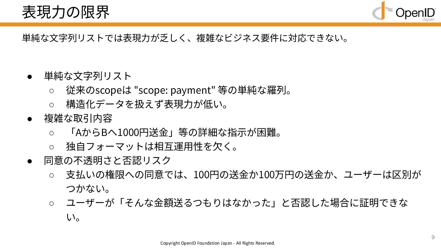 単純な⽂字列リスト ◦ 従来のscopeは "scope: payment" 等の単純な羅列。 ◦ 構造化データを扱えず表現⼒が低い。 • 複雑な取引内容 ◦ 「AからBへ1000円送⾦」等の詳細な指⽰が困難。 ◦ 独⾃フォーマットは相互運⽤性を⽋く。 • 同意の不透明さと否認リスク ◦ ⽀払いの権限への同意では、100円の送⾦か100万円の送⾦か、ユーザーは区別が つかない。 ◦ ユーザーが「そんな⾦額送るつもりはなかった」と否認した場合に証明できな い。 単純な⽂字列リストでは表現⼒が乏しく、複雑なビジネス要件に対応できない。 9